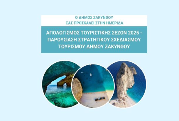 Ο Δήμος Ζακύνθου πραγματοποιεί ΗΜΕΡΙΔΑ με θέμα:«Απολογισμός Τουριστικής Σεζον2025 & Παρουσίαση Στρατηγικού Σχεδιασμού Τουρισμού Δήμου Ζακύνθου»
