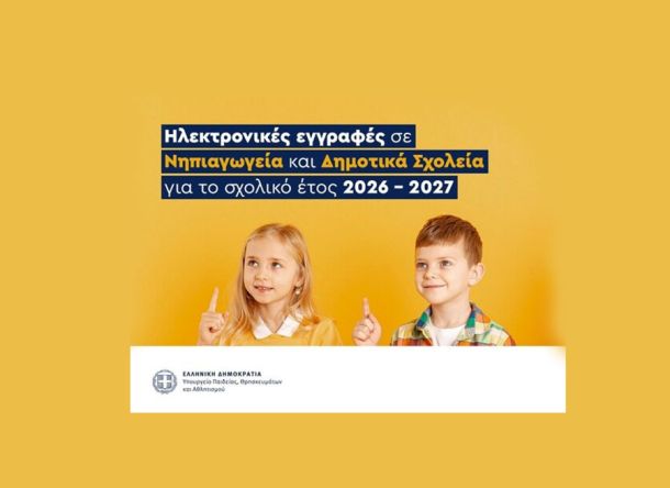 Από τις 2 έως και τις 23 Μαρτίου 2026 θα πραγματοποιηθούν οι ηλεκτρονικές εγγραφές μαθητών και μαθητριών στα δημόσια Νηπιαγωγεία και Δημοτικά Σχολεία γενικής εκπαίδευσης για το σχολικό έτος 2026-2027, μέσω της Ενιαία Ψηφιακή Πύλη της Δημόσιας Διοίκησης (gov.gr).