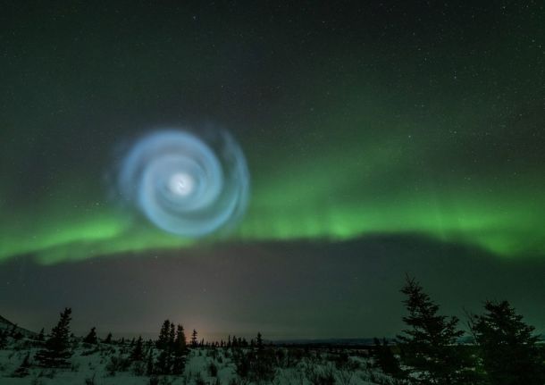 Το εξωπραγματικό βόρειο σέλας της Αλάσκα έγινε ακόμα πιο εξωπραγματικό το Σάββατο με την εμφάνιση μιας φωτεινής γαλάζιας σπείρας που απλώθηκε στον ουρανό σαν γαλαξίας.