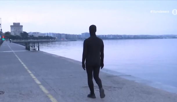 Μια σιωπηλή φιγούρα ντυμένη με μαύρο ολόσωμο spandex zentai, που καλύπτει και το πρόσωπο, κυκλοφορεί στη Θεσσαλονίκη, (φωτογραφία πάνω – πηγή ΕΡΤ) προκαλώντας ποικίλες αντιδράσεις στους περαστικούς.