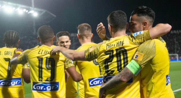 Στο 7ο λεπτό η ΑΕΚ σκόραρε στην Τούμπα με τον Αμραμπατ, αλλά ακυρώθηκε για φάουλ του Γκατσίνοβιτς στην αρχή της φάσης.
