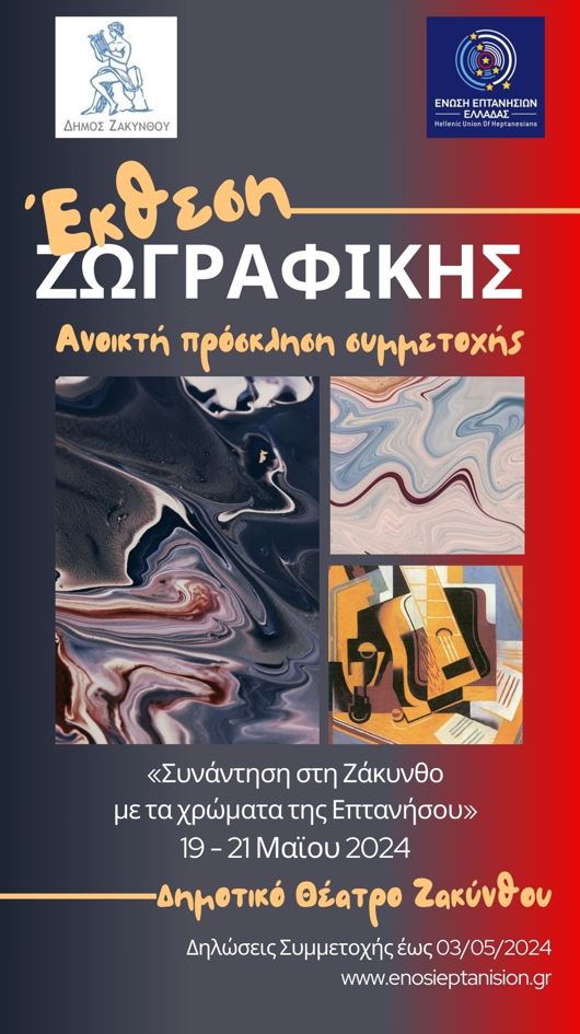 Ανοιχτή πρόσκληση συμμετοχής στην ομαδική έκθεση ζωγραφικής με θέμα: «Συνάντηση στη Ζάκυνθο με τα χρώματα της Επτανήσου» - 19 έως 21 Μαϊου 2024, Δημοτικό Θέατρο Ζακύνθου (Λομβάρδου 48 - Ζάκυνθος).