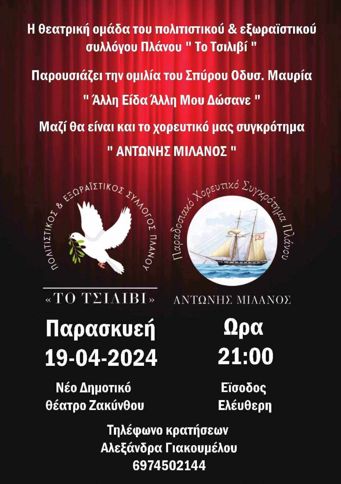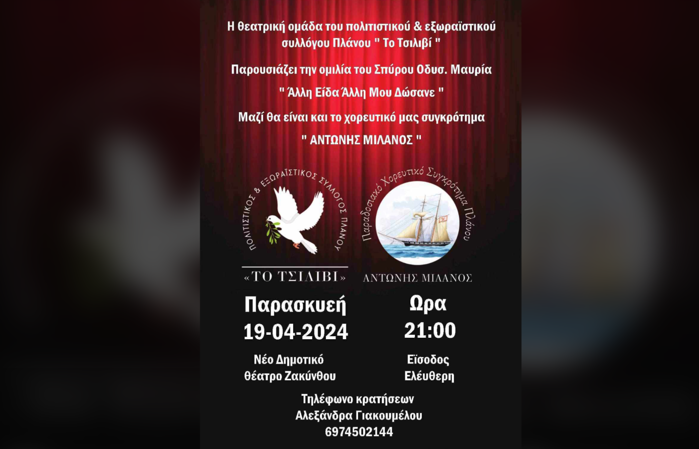 Η θεατρική ομάδα του πολιτιστικού και εξωραϊστικού συλλόγου Πλάνου «ΤΟ ΤΣΙΛΙΒΙ» ανεβάζει την ομιλία του Σπύρου Οδυσ. Μαυρία «Άλλη είδα άλλη μου δώσανε» για μία και μόνο παράσταση στις 19/04 στις 21:00 το βράδυ στο νέο δημοτικό θέατρο Ζακύνθου.