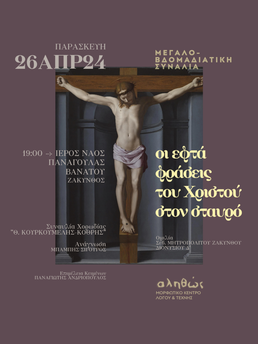 Το Μορφωτικό Κέντρο Λόγου και Τέχνης “Αληθώς”, εν όψει της Μεγάλης Εβδομάδας και του Πάσχα, παρουσιάζει ειδικό αφιέρωμα, με γενικό τίτλο: “Οι εφτά φράσεις του Χριστού στον Σταυρό”, την Παρασκευή, 26 Απριλίου 2024, μέσα στον Ναό της Παναγούλας Βανάτου, ώρα 8.30 το βράδυ.