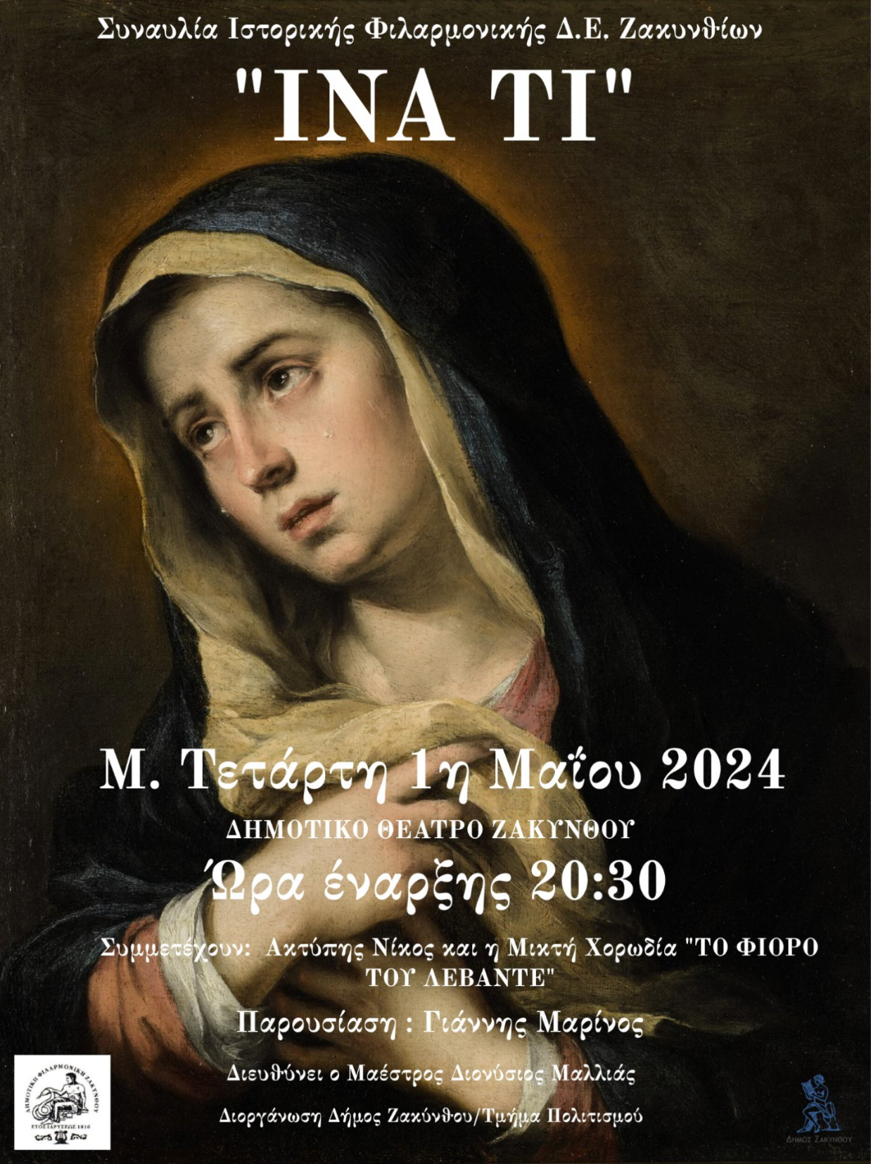 Η Δημοτική Αρχή Ζακύνθου σας προσκαλεί στην συναυλία της Ιστορικής Φιλαρμονικής Δ.Ε. Ζακυνθίων «ΙΝΑ ΤΙ» την Μεγάλη Τετάρτη 1η Μαΐου του 2024 και ώρα 20:30, στο Δημοτικό Θέατρο Ζακύνθου.