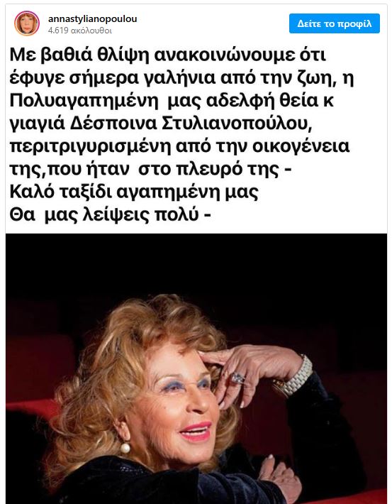 «Με βαθιά θλίψη ανακοινώνουμε ότι έφυγε γαλήνια από τη ζωή η πολυαγαπημένη μας αδελφή, θεία και γιαγιά Δέσποινα Στυλιανοπούπου, περιτριγυρισμένη από την οικογένειά της, που ήταν στο πλευρό της. Καλό ταξίδι αγαπημένη μας, θα μας λείψεις πολύ», έγραψε στο instagram.