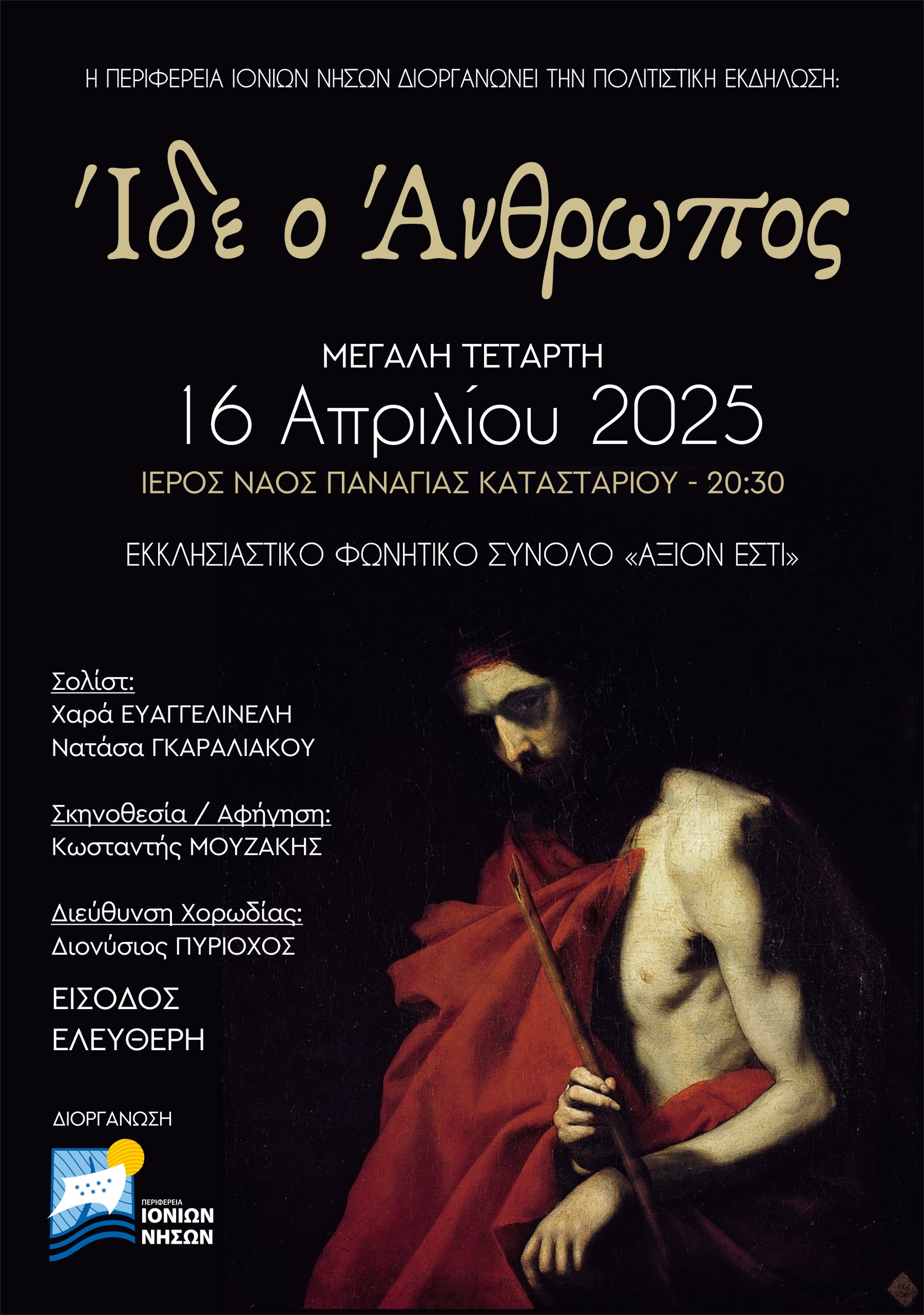Η Περιφέρεια Ιονίων Νήσων – Περιφερειακή Ενότητα Ζακύνθου, με αίσθημα σεβασμού προς την πνευματικότητα της Μεγάλης Εβδομάδας, παρουσιάζει την πολιτιστική εκδήλωση με τίτλο «Ίδε ο Άνθρωπος», τη Μεγάλη Τετάρτη, 16 Απριλίου 2025 και ώρα 20:30, στον Ιερό Ναό Παναγίας Κατασταρίου στη Ζάκυνθο.