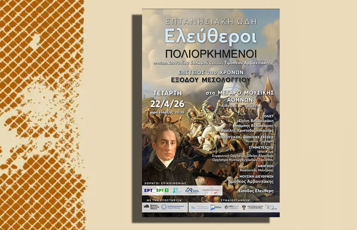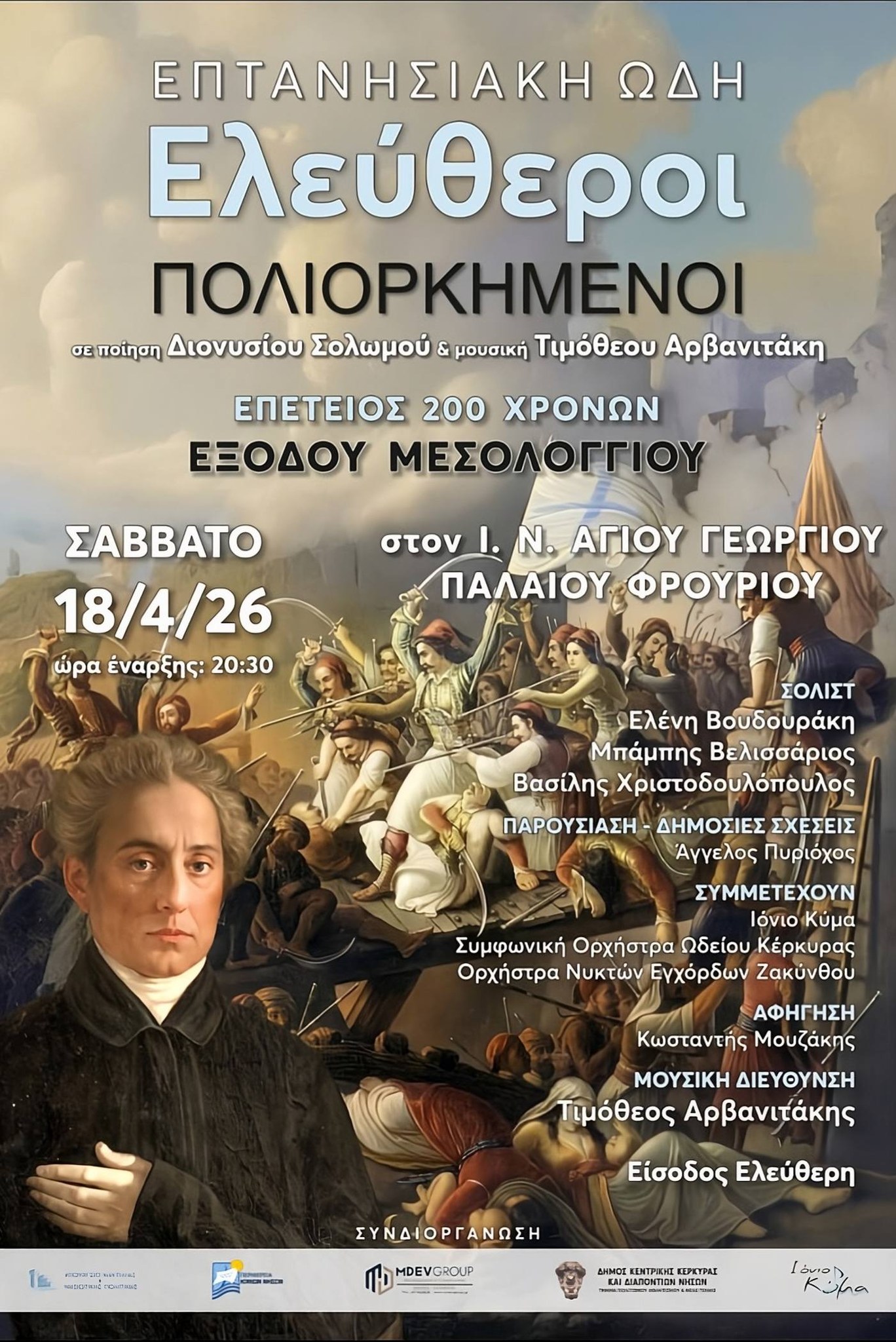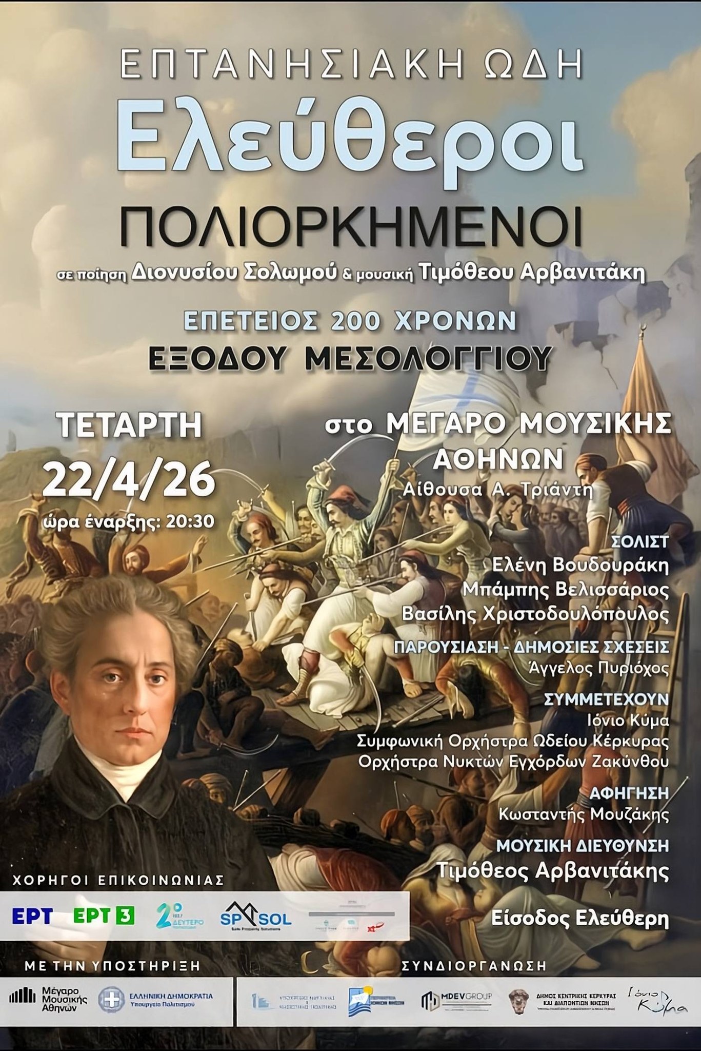Με μια μεγαλειώδη μουσική παράσταση, τα Επτάνησα αποδίδουν φόρο τιμής στην επέτειο των 200 χρόνων από την Ηρωική Έξοδο του Μεσολογγίου. Το εμβληματικό έργο του εθνικού μας ποιητή Διονυσίου Σολωμού, «Ελεύθεροι Πολιορκημένοι», μεταφέρεται στη σκηνή μέσα από τη σύγχρονη μουσική δημιουργία «Επτανησιακή Ωδή» του συνθέτη Τιμόθεου Αρβανιτάκη.