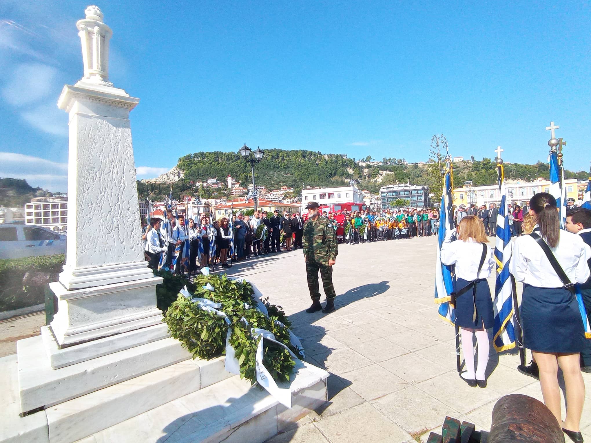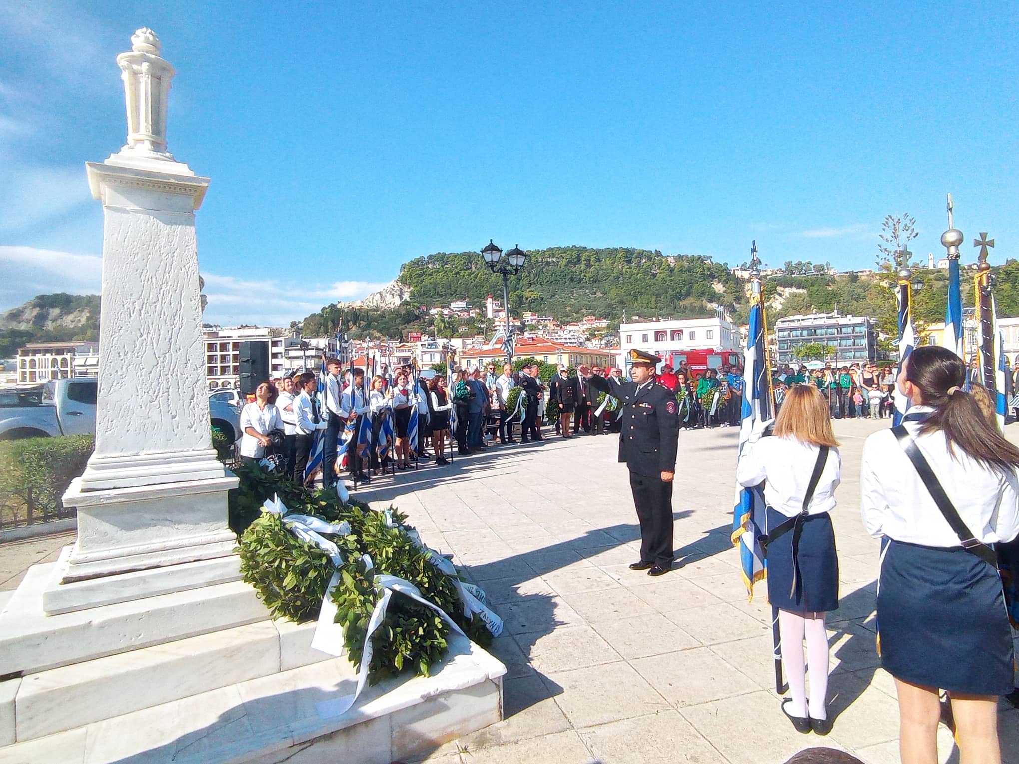 Με εξαιρετικό καιρό και παρουσία χιλιάδων πολιτών πραγματοποιήθηκε η καθιερωμένη μαθητική παρέλαση της 28η Οκτωβρίου στη Ζάκυνθο , μπροστά από το Μέγαρο της Π.Ε. Ζακύνθου