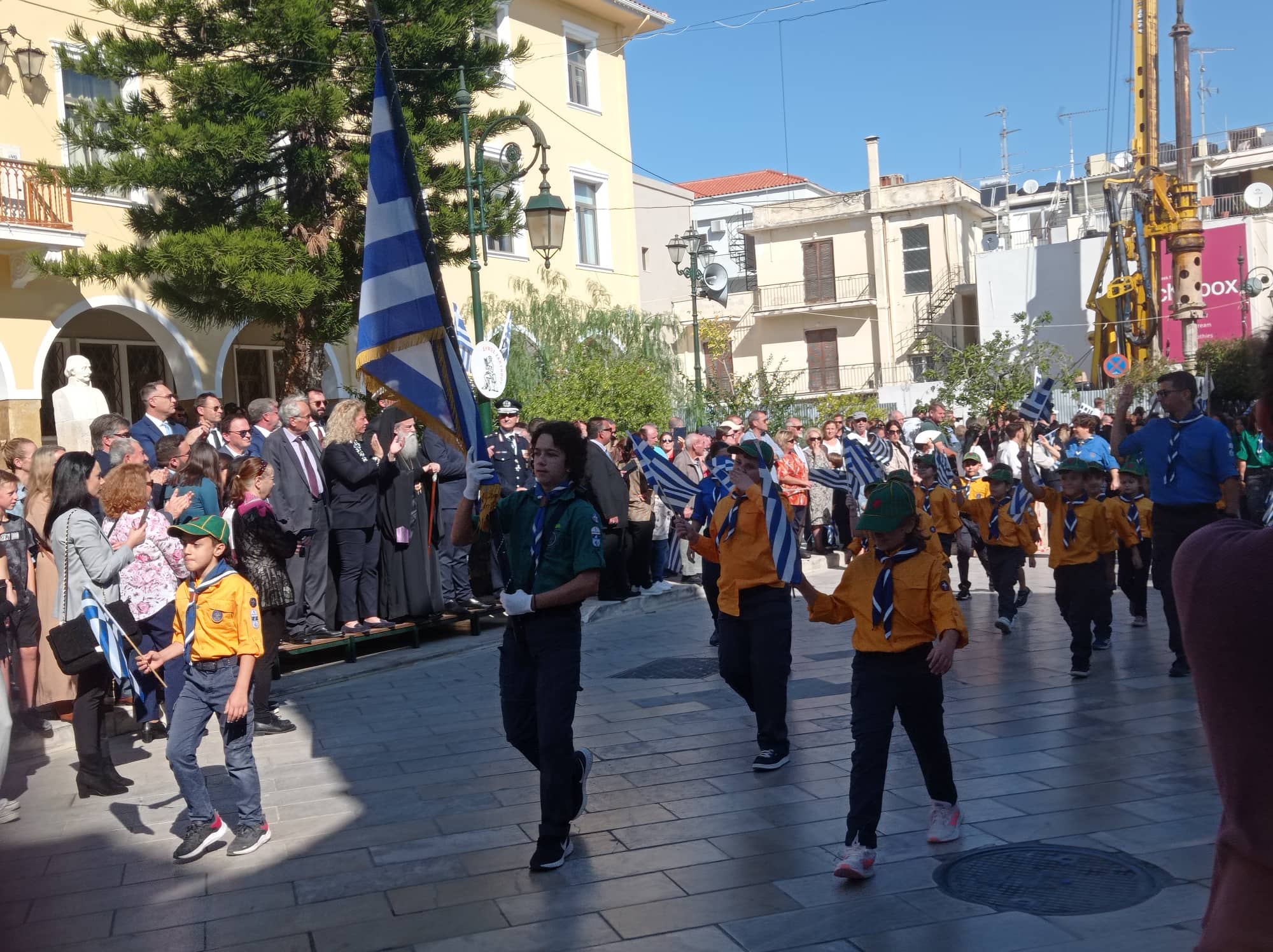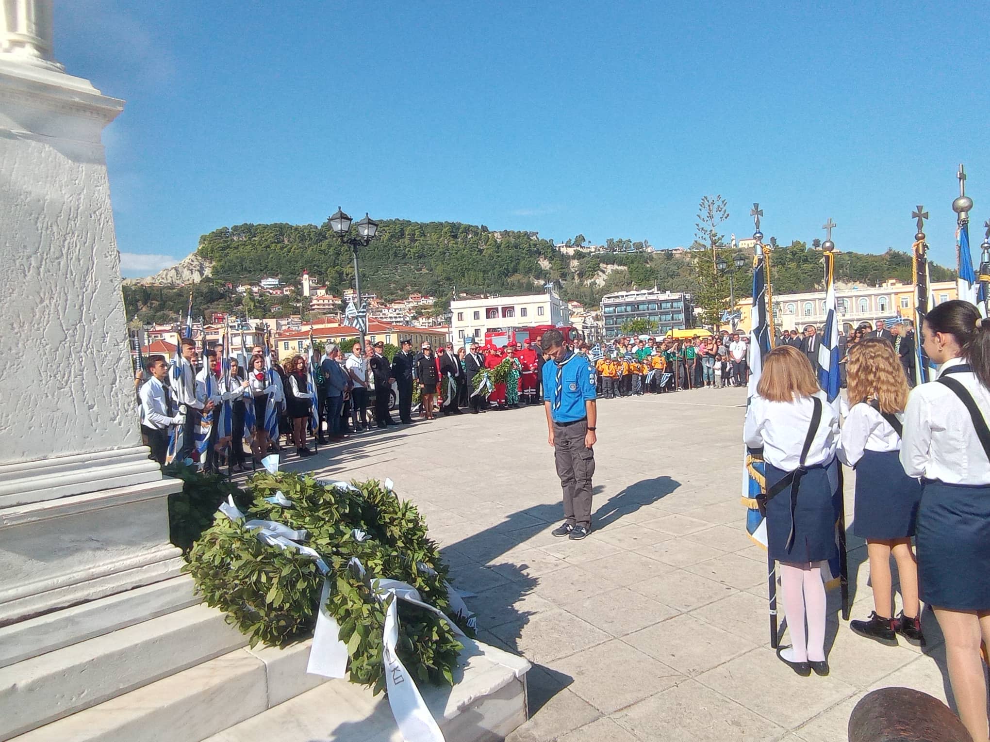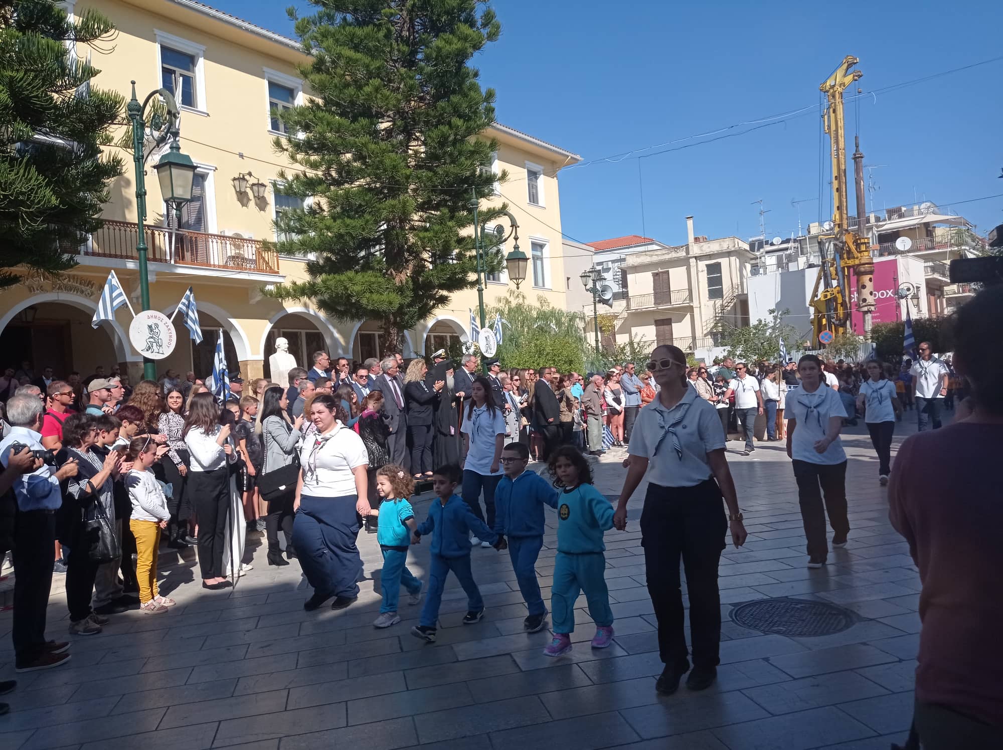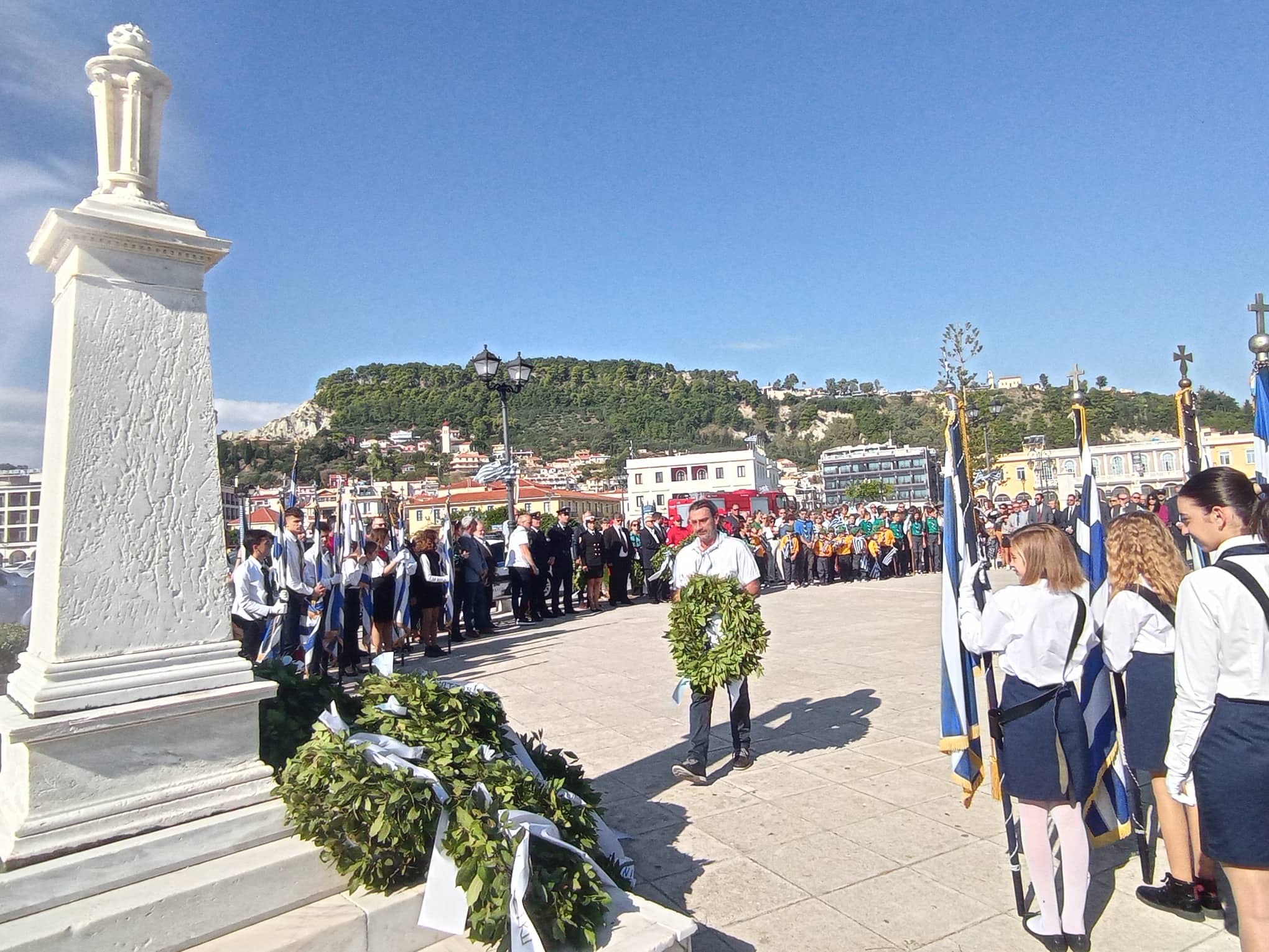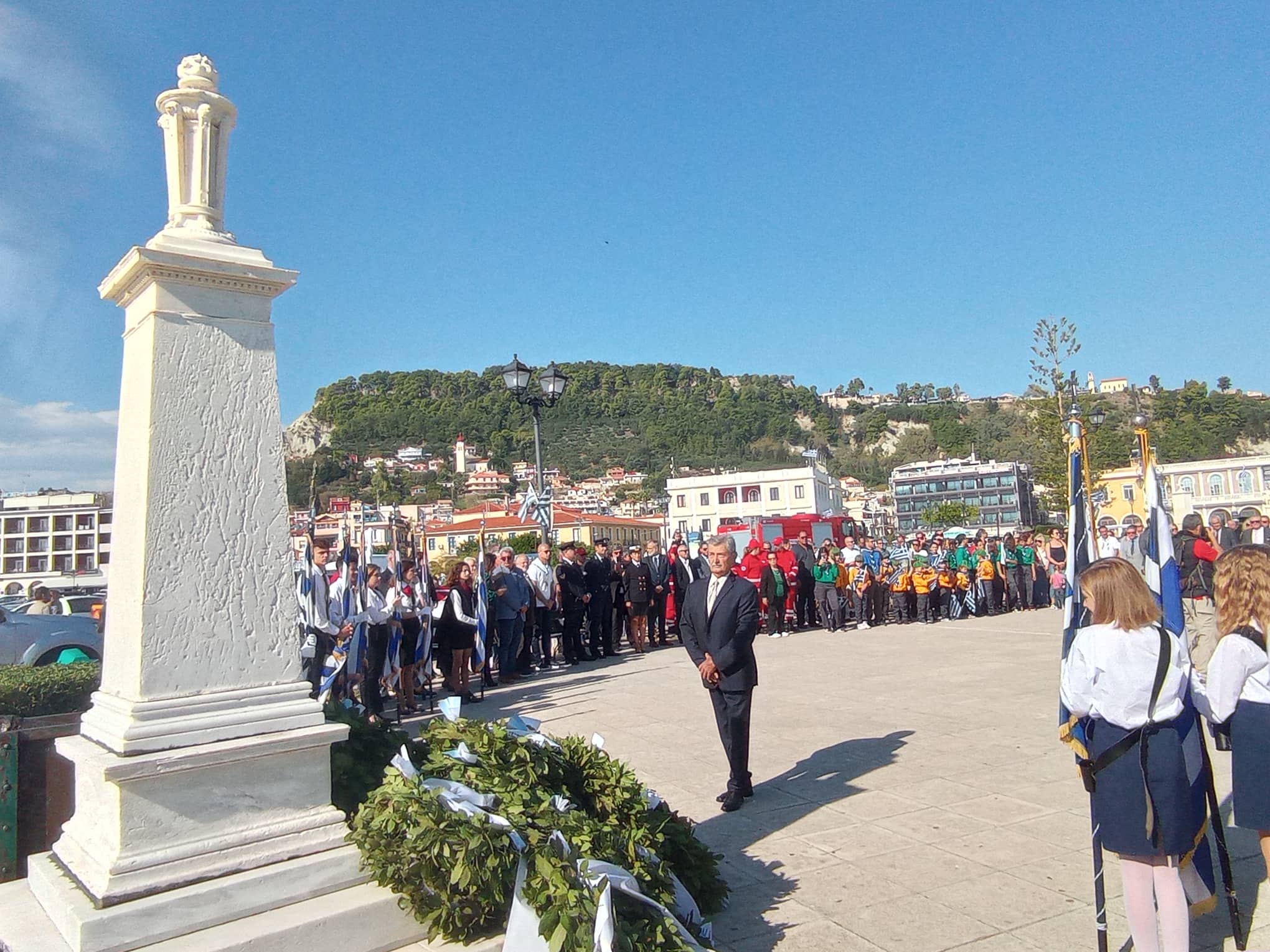 Η παρέλαση των σχολείων της Α΄βάθμιας και Β΄βάθμιας εκπαίδευσης και των σωμάτων Ελληνικού Οδηγισμού και Ελλήνων Προσκόπων μπροστά από το Μέγαρο της Π.Ε. Ζακύνθου