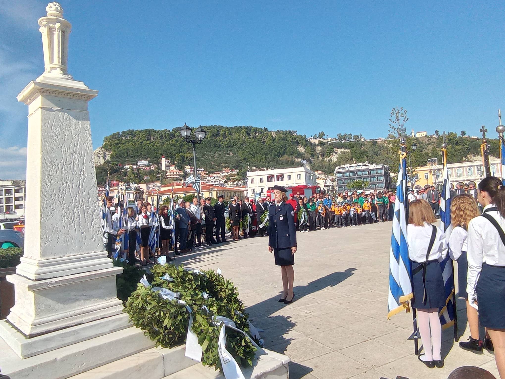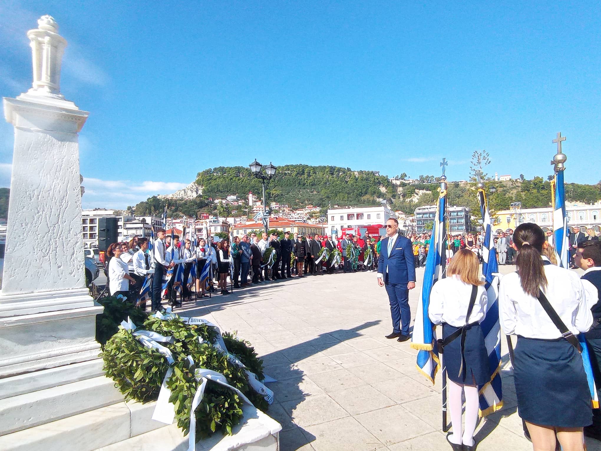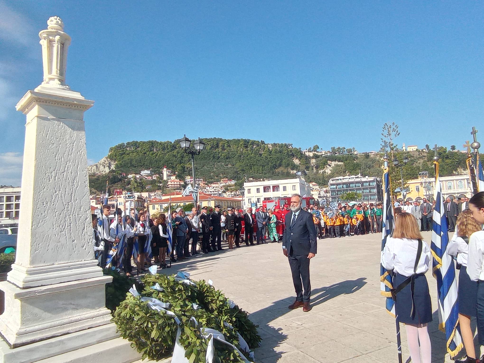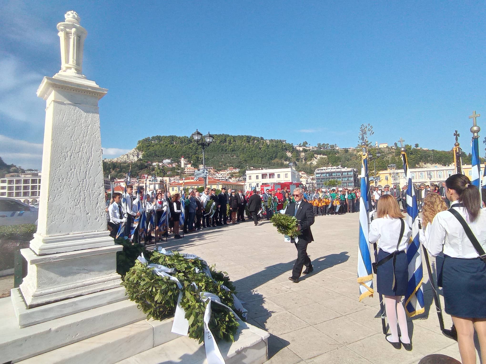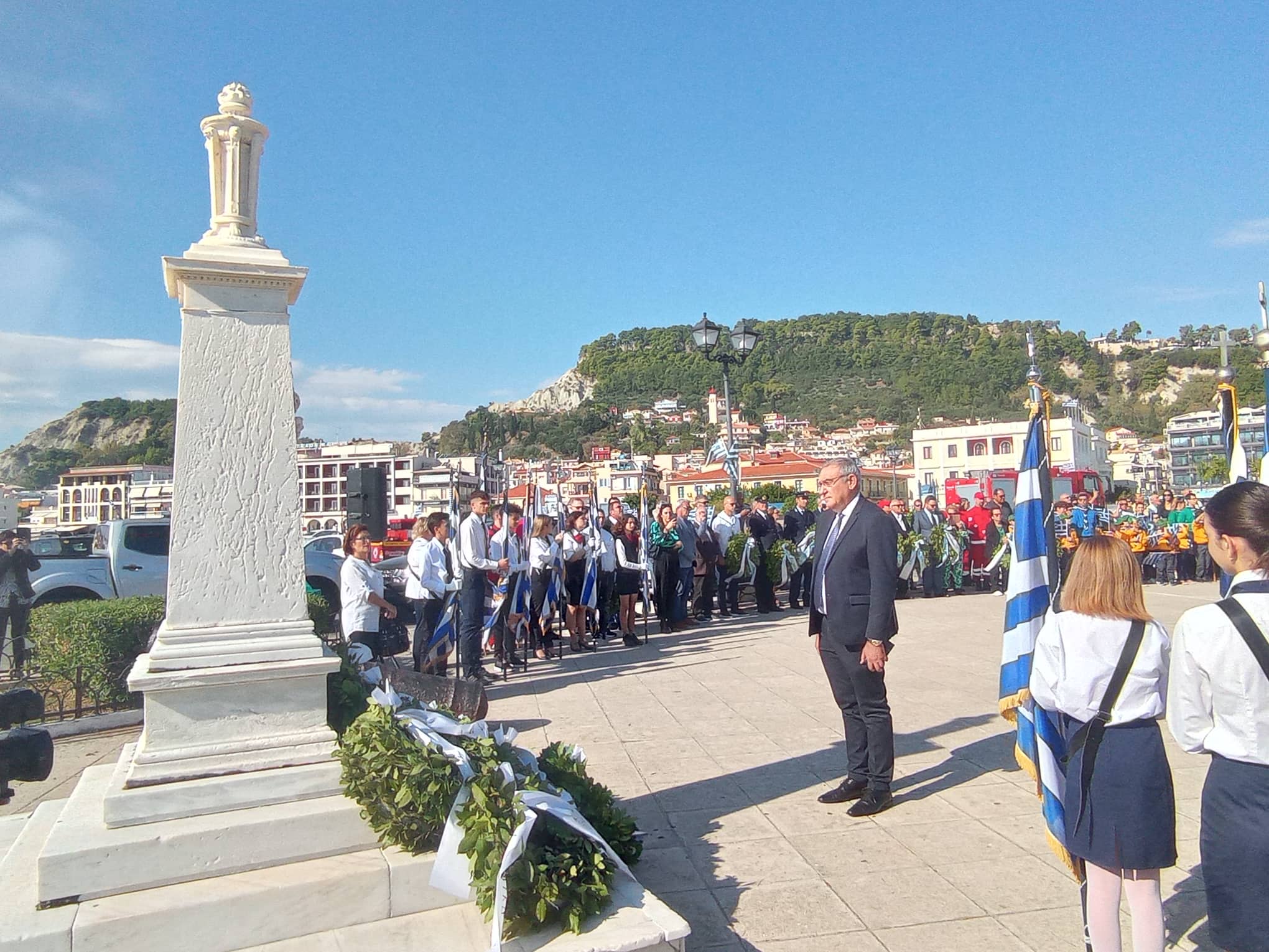 Η παρέλαση των σχολείων της Α΄βάθμιας και Β΄βάθμιας εκπαίδευσης και των σωμάτων Ελληνικού Οδηγισμού και Ελλήνων Προσκόπων μπροστά από το Μέγαρο της Π.Ε. Ζακύνθου