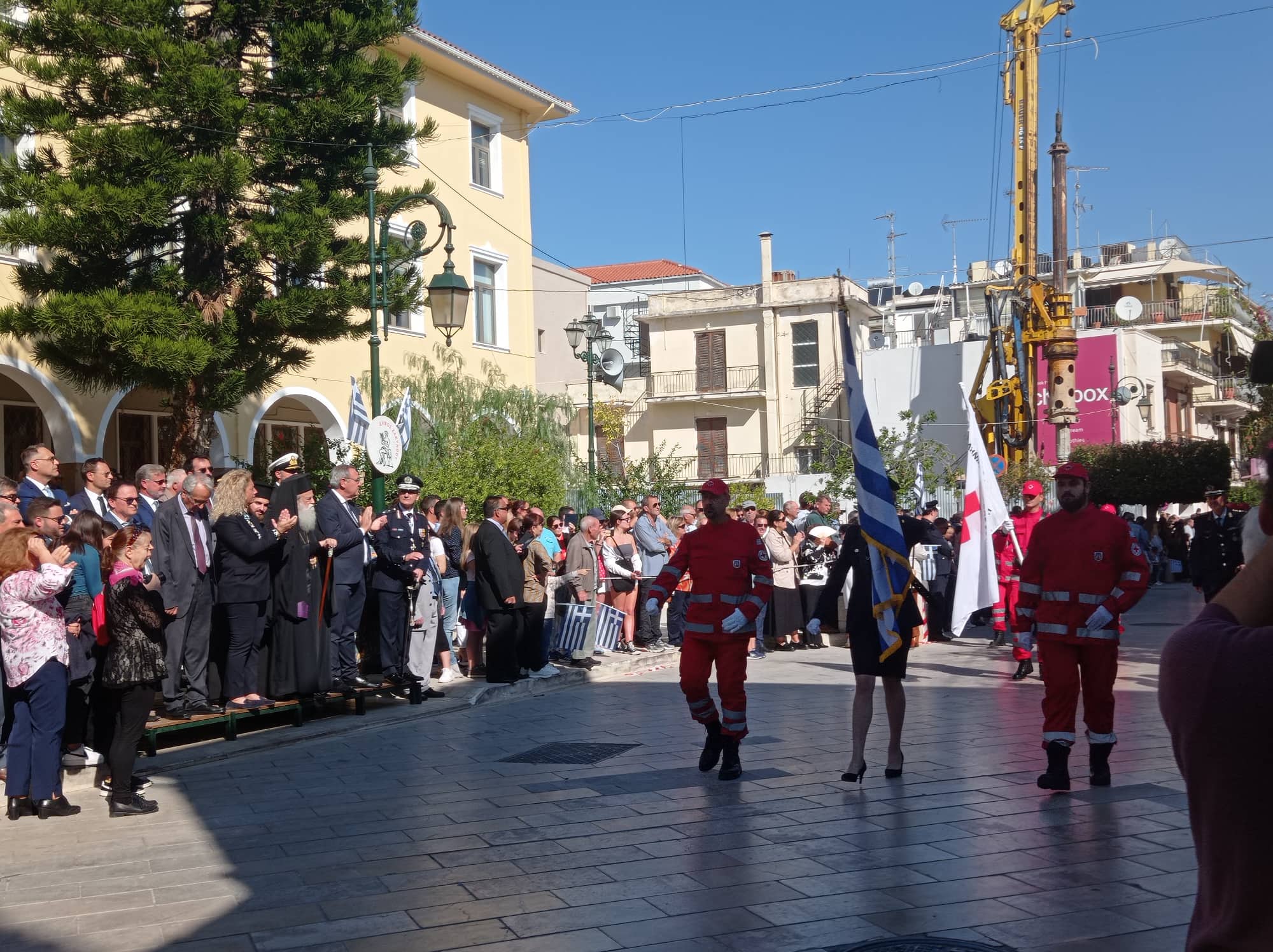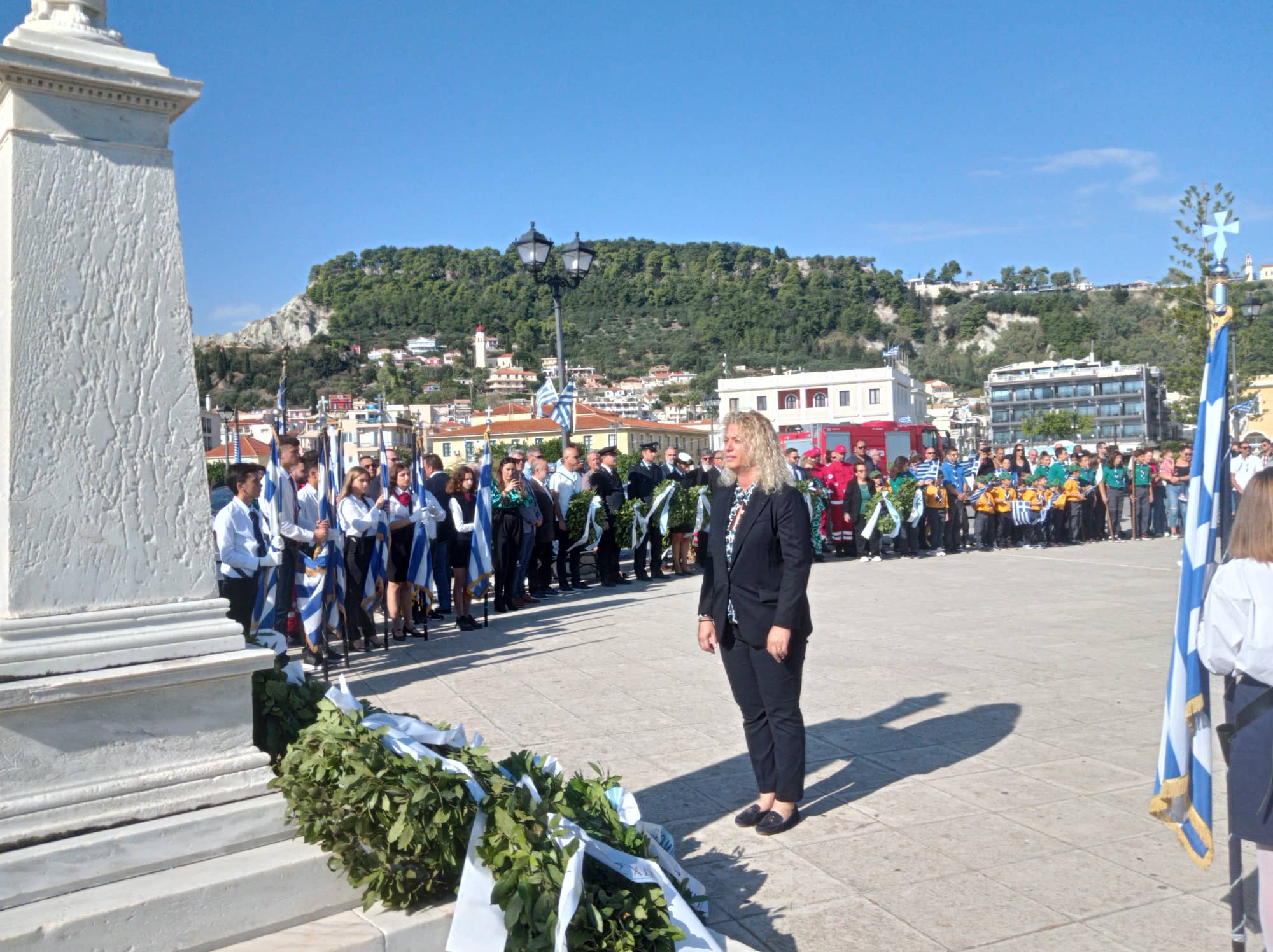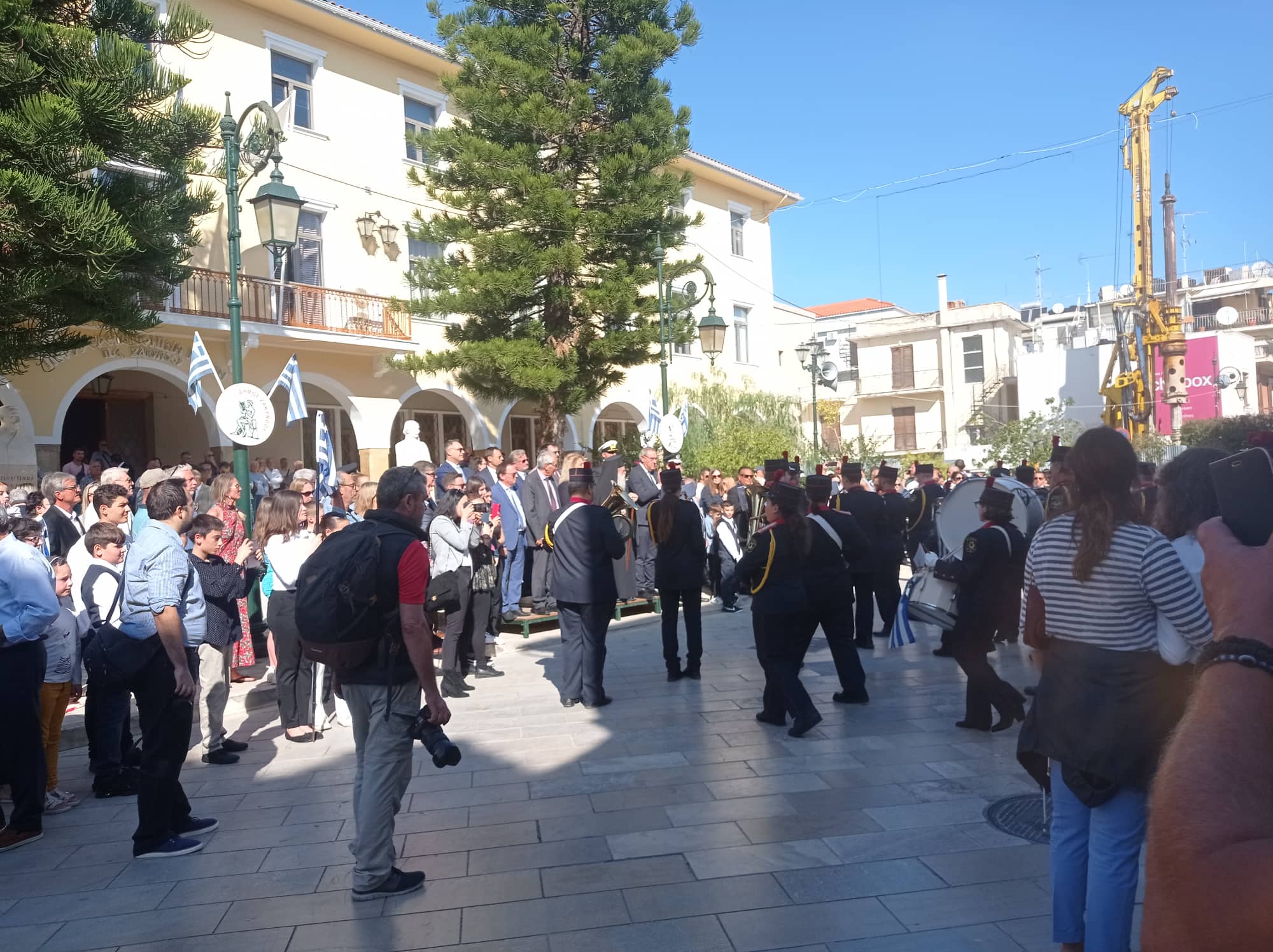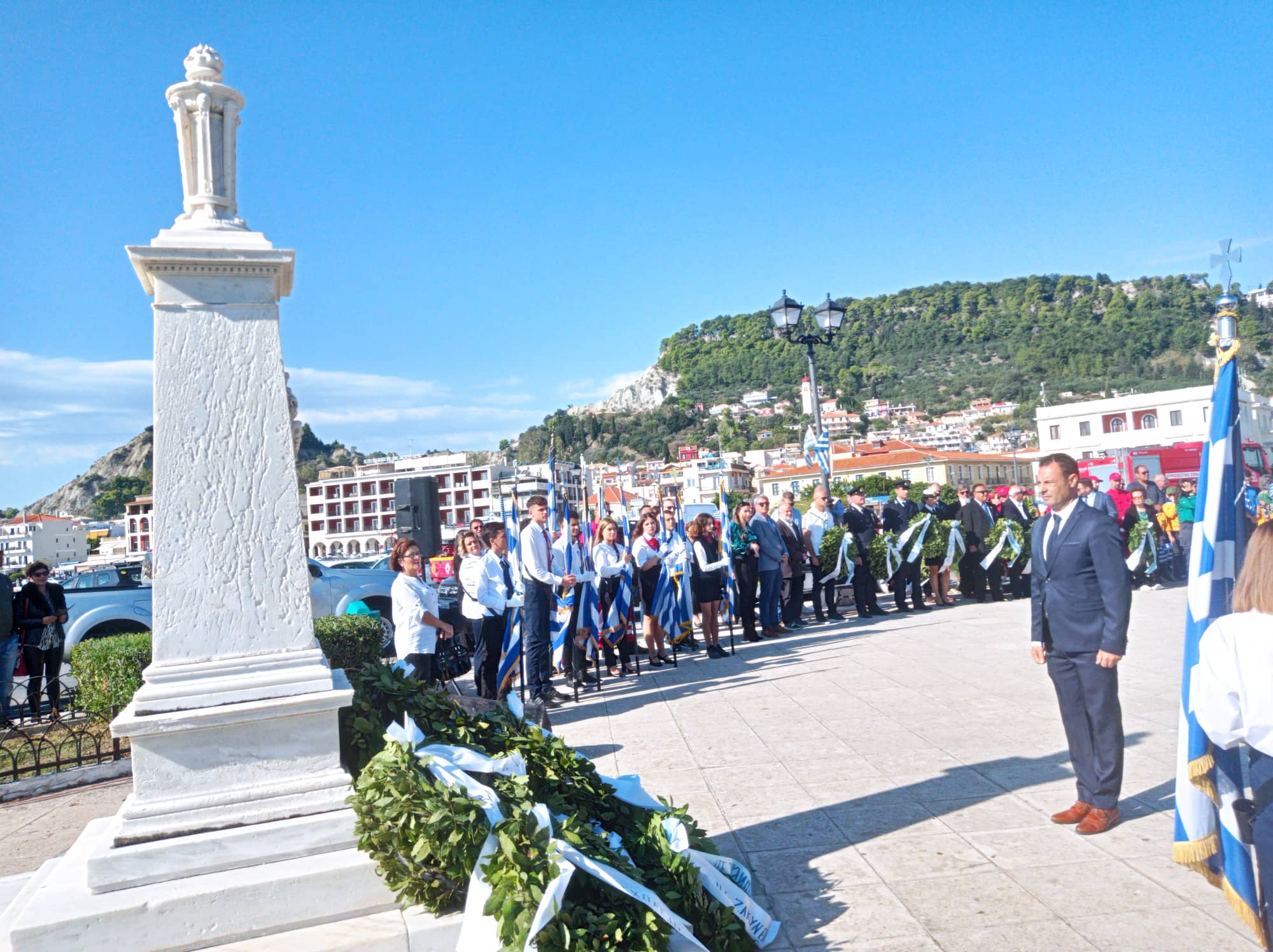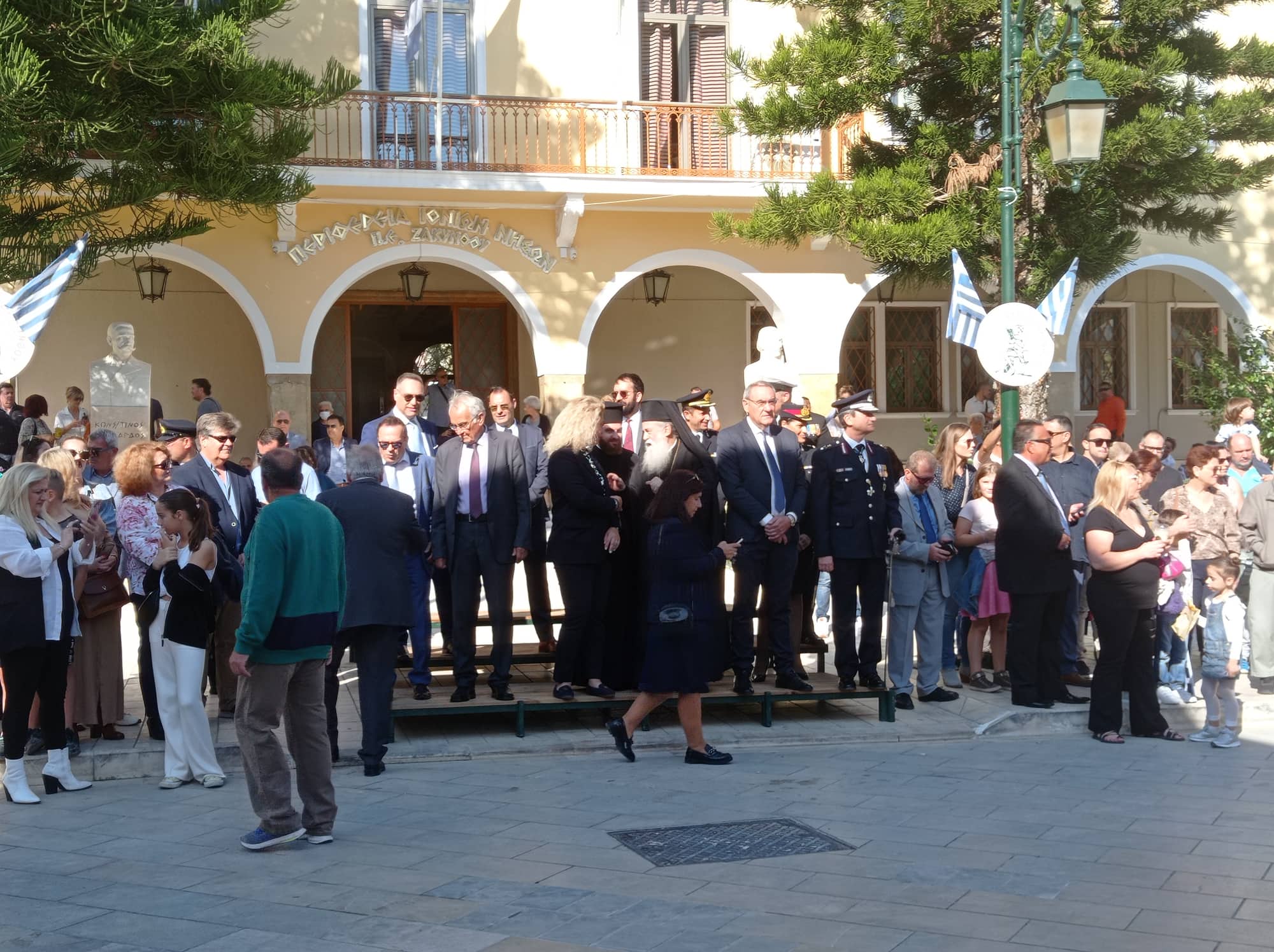Η παρέλαση των σχολείων της Α΄βάθμιας και Β΄βάθμιας εκπαίδευσης και των σωμάτων Ελληνικού Οδηγισμού και Ελλήνων Προσκόπων μπροστά από το Μέγαρο της Π.Ε. Ζακύνθου