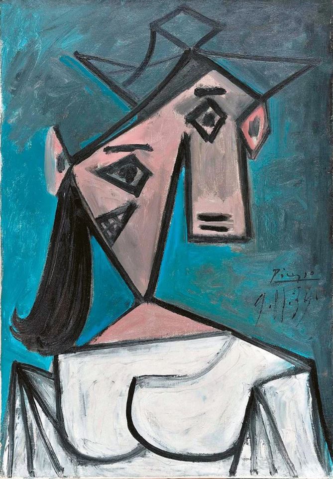 Το «Γυναικείο κεφάλι», διαστάσεων 56x40 εκ., που φιλοτέχνησε το 1939 ο Ισπανός ζωγράφος, αποτυπώνει τη μούσα του, φωτογράφο Ντόρα Μάαρ, με την οποία έζησε μια θυελλώδη σχέση για εννέα ολόκληρα χρόνια. Ενας παράφορος έρωτας που ξεκίνησε στα 54 του χρόνια ενώ εκείνη ήταν μόλις 29 ετών, ο οποίος, αν και έληξε άδοξα, με την ίδια να βυθίζεται για πάντα στα σκοτάδια του εαυτού της και τη μοναξιά, παρέμεινε αιώνια μούσα και η πιο δυνατή σχέση της ζωής του. Μια σχέση που αποτυπώθηκε σε λευκό καμβά με γαλάζιες και πράσινες αποχρώσεις.