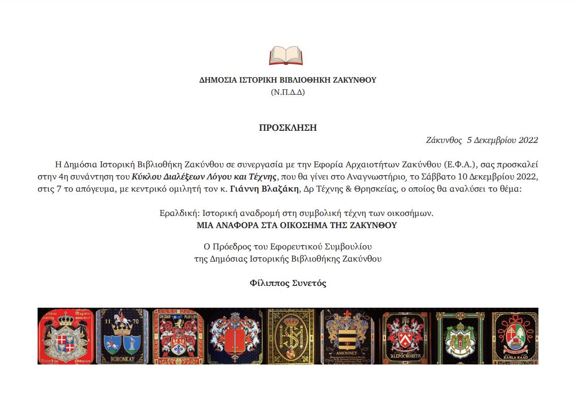 Η Δημόσια Ιστορική Βιβλιοθήκη Ζακύνθου σε συνεργασία με την Εφορία Αρχαιοτήτων Ζακύνθου (Ε.Φ.Α.), πραγματοποιεί την 4η συνάντηση του Κύκλου Διαλέξεων Λόγου και Τέχνης, που θα γίνει στο Αναγνωστήριο, το Σάββατο 10 Δεκεμβρίου 2022,στις 7 το απόγευμα, με κεντρικό ομιλητή τον κ. Γιάννη Βλαζάκη, Δρ Τέχνης & Θρησκείας, ο οποίος θα αναλύσει το θέμα: Εραλδική: Ιστορική αναδρομή στη συμβολική τέχνη των οικοσήμων -ΜΙΑ ΑΝΑΦΟΡΑ ΣΤΑ ΟΙΚΟΣΗΜΑ ΤΗΣ ΖΑΚΥΝΘΟΥ