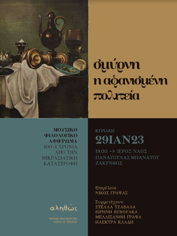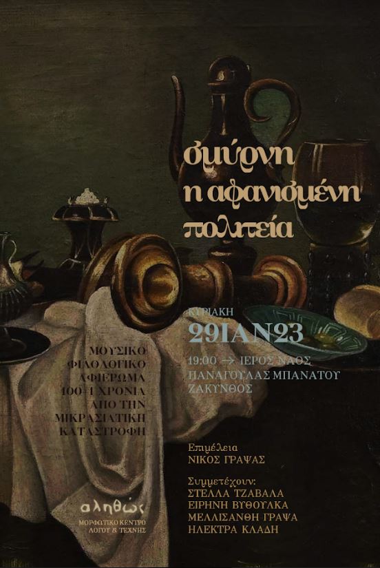 Καθώς ήδη έχουν συμπληρωθεί 100 χρόνια από τις αποφράδες εκείνες ημέρες της Μικρασιατικής Καταστροφής (1922-2022), το Μορφωτικό Κέντρο Λόγου και Τέχνης «Αληθώς», πολιτιστική έκφραση της Ιεράς Μητροπόλεως Ζακύνθου, συμμετέχει με μιαν ειδική μουσικο-φιλολογική βραδιά τιμής και μνήμης, με γενικό τίτλο «ΣΜΥΡΝΗ, Η ΑΦΑΝΙΣΜΕΝΗ ΠΟΛΙΤΕΙΑ».