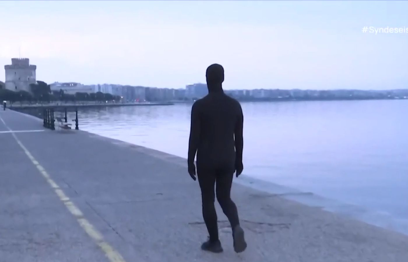 Μια σιωπηλή φιγούρα ντυμένη με μαύρο ολόσωμο spandex zentai, που καλύπτει και το πρόσωπο, κυκλοφορεί στη Θεσσαλονίκη, (φωτογραφία πάνω – πηγή ΕΡΤ) προκαλώντας ποικίλες αντιδράσεις στους περαστικούς.