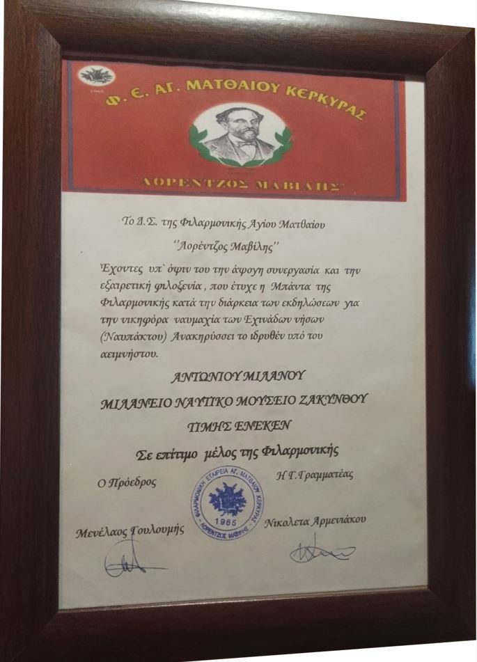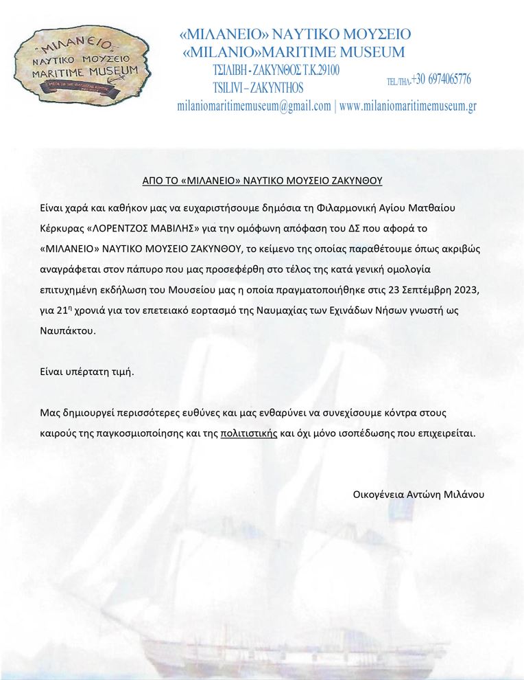 Είναι χαρά και καθήκον μας να ευχαριστήσουμε δημόσια τη Φιλαρμονική Αγίου Ματθαίου Κέρκυρας «ΛΟΡΕΝΤΖΟΣ ΜΑΒΙΛΗΣ» για την ομόφωνη απόφαση του ΔΣ που αφορά το «ΜΙΛΑΝΕΙΟ» ΝΑΥΤΙΚΟ ΜΟΥΣΕΙΟ ΖΑΚΥΝΘΟΥ, το κείμενο της οποίας παραθέτουμε όπως ακριβώς αναγράφεται στον πάπυρο που μας προσεφέρθη στο τέλος της κατά γενική ομολογία επιτυχημένη εκδήλωση του Μουσείου μας η οποία πραγματοποιήθηκε στις 23 Σεπτέμβρη 2023, για 21η χρονιά για τον επετειακό εορτασμό της Ναυμαχίας των Εχινάδων Νήσων γνωστή ως Ναυπάκτου.