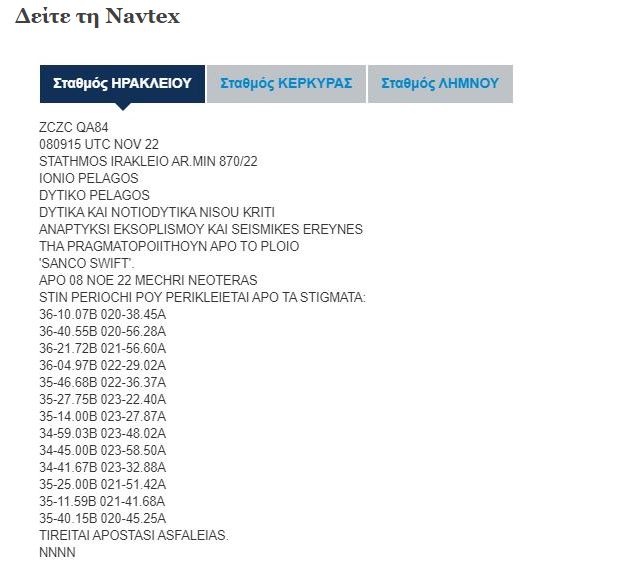 NAVTEX που εξέδωσε το Πολεμικό Ναυτικό, προβλέπει ότι από σήμερα 8 Νοεμβρίου 2022 και μέχρι νεωτέρας, δεσμεύονται περιοχές στο Ιόνιο Πέλαγος, το Δυτικό Πέλαγος και δυτικά και ανατολικά της Κρήτης, προκειμένου το πλοίο Nanco Swift να πραγματοποιήσει ανάπτυξη εξοπλισμού και σεισμικές έρευνες.