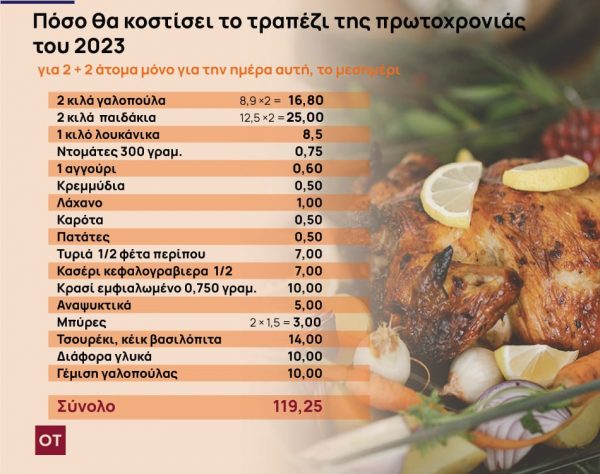 Το ΙΝΚΑ «έστρωσε» το τραπέζι για τέσσερα άτομα, κάνοντας έρευνα τιμών στην αγορά και με βάση συγκεκριμένα είδη συμπεραίνει ότι φέτος θα κοστίσει 120 ευρώ μόνο για το μεσημέρι της πρωτοχρονιάς. Το κόστος ανεβαίνει στα 300 ευρώ εάν συνυπολογιστεί και το τραπέζι της παραμονής.