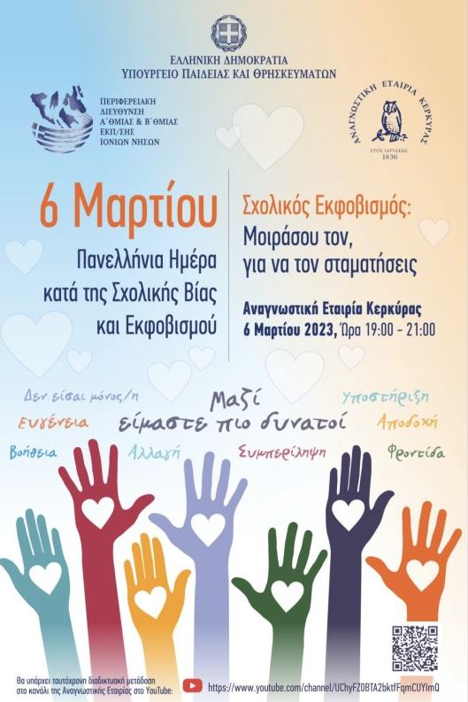 Η 6η Μαρτίου έχει οριστεί ως Πανελλήνια Ημέρα κατά της βίας στο σχολείο. Η Περιφερειακή Διεύθυνση Εκπαίδευσης Ιονίων Νήσων σε συνεργασία με την Διοικητική Επιτροπή της Αναγνωστικής Εταιρίας Κερκύρας διοργανώνει εκδήλωση, με στόχο την ευαισθητοποίηση και τον περιορισμό φαινομένων σχολικής βίας και εκφοβισμού.