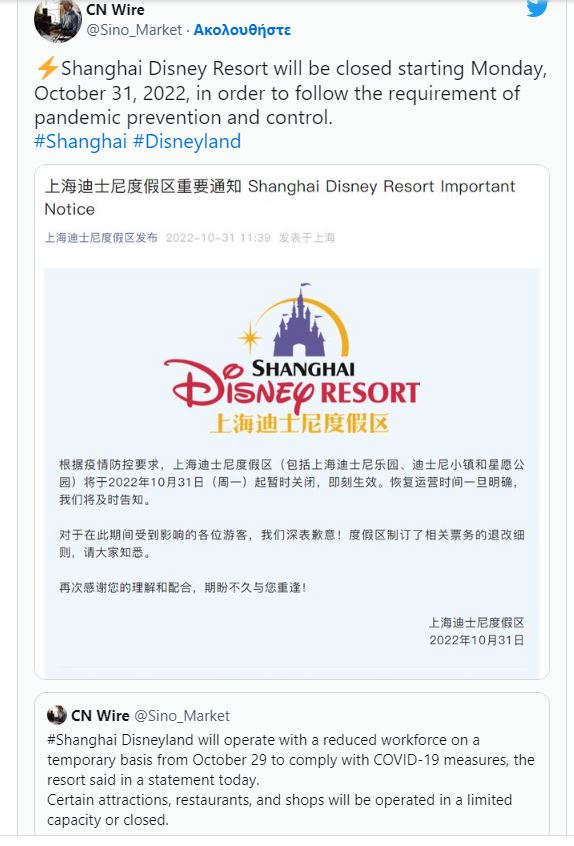 Η εξέλιξη αυτή αποτελεί ένα ακόμα πρόβλημα για τη Shanghai Disney Resort, που ήταν κλειστή για πάνω από τρεις μήνες κατά τη διάρκεια του lockdown της Σανγκάης νωρίτερα φέτος.
