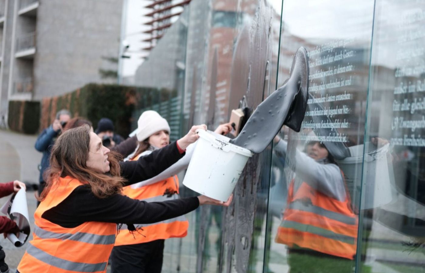 Νωρίτερα, η ομάδα «Letzte Generation» (Τελευταία γενιά), που έχει οργανώσει πολλές κινητοποιήσεις για να ευαισθητοποιήσει τους πολίτες ενάντια στην κλιματική αλλαγή, ανάρτησε σε ιστοτόπους κοινωνικής δικτύωσης βίντεο που δείχνει ακτιβιστές ντυμένους με πορτοκαλί γιλέκα να χύνουν το μαύρο υγρό σε ορισμένα από τα 19 γυάλινα πάνελ, ύψους τριών μέτρων, όπου είναι χαραγμένα τα άρθρα του Συντάγματος. Κατόπιν, κόλλησαν επάνω τους αφίσες με το σύνθημα «Πετρέλαιο ή συνταγματικά δικαιώματα;».