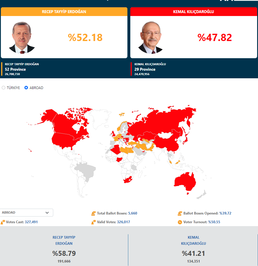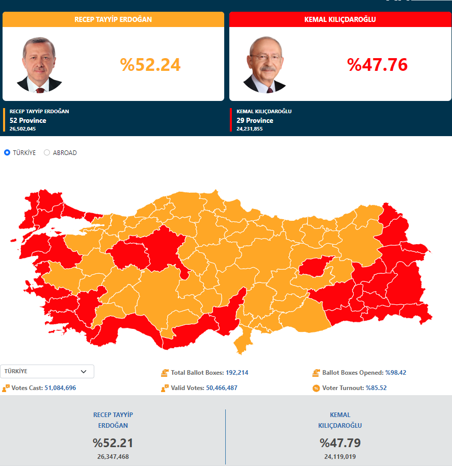 Θυμίζουμε ότι στον πρώτο γύρο η συμμετοχή έφτασε στο 88,84%, ενώ ο Ρετζέπ Ταγίπ Ερντογάν είχε λάβει 49,52% και ο Κεμάλ Κιλιτσντάρογλου είχε συγκεντρώσει το 44,88%.