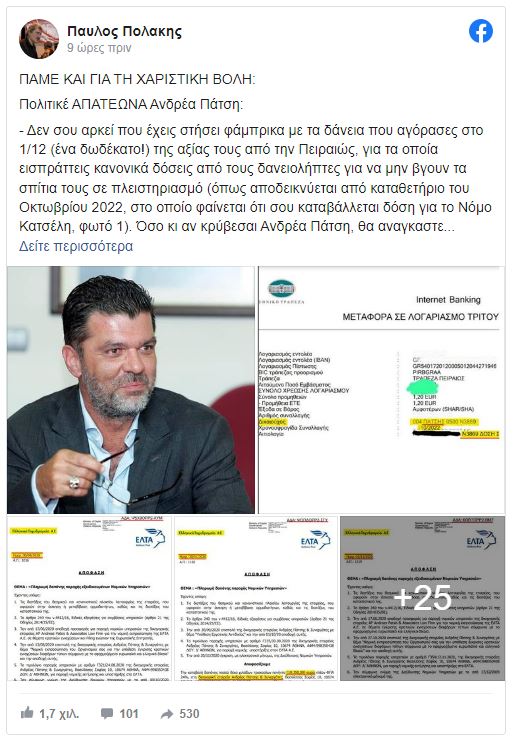 Σημειώνεται πως μετά τη χθεσινή καταγγελία του αναπληρωτή τομεάρχη Διαφάνειας του ΣΥΡΙΖΑ – Προοδευτική Συμμαχία εις βάρος του βουλευτή Γρεβενών της ΝΔ, χαρακτηρίζοντάς τον μάλιστα «προκλητικό παραβάτη του νόμου» καθώς φέρεται να είναι ιδιοκτήτης τριών εταιρειών που έχουν σχέση με διαχείριση «κόκκινων» δανείων, ο Παύλος Πολάκης επανήλθε σήμερα με νέα ανάρτηση για τον «γαλάζιο» βουλευτή, κάνοντας αναφορά για ποσό άνω του ενός εκατομμυρίου ευρώ (1.019.222,81 ευρώ) το οποίο κατέληξε στην… τσέπη του κ. Πάτση από τα ΕΛΤΑ για «αέρα νομικές υπηρεσίες», όπως χαρακτηριστικά σημειώνει.