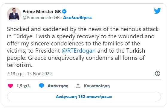Το δικό του μήνυμα συμπαράστασης στην Τουρκία, για την έκρηξη με τους έξι νεκρούς στην Κωνσταντινούπολη, έστειλε ο Έλληνας πρωθυπουργός, Κυριάκος Μητσοτάκης, δηλώνοντας συγκλονισμένος και λυπημένος και κάνοντας λόγο για μια αποτρόπαια επίθεση.