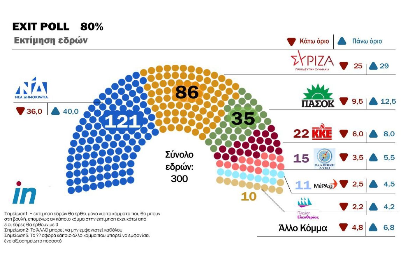 Συγκεκριμένα, η ΝΔ θα κινηθεί μεταξύ 36% έως 40% και θα λάβει περί τις 121 έδρες (38%), ο ΣΥΡΙΖΑ 25% έως 29% περί τις 86 έδρες (28%), το ΠΑΣΟΚ από 9,5% έως 12,5% λαμβάνοντας 35 έδρες (11%), το ΚΚΕ από 6% έως 8% γύρω στις 22 έδρες (7%), η Ελληνική Λύση από 3,5% έως 5,5% δηλαδή γύρω στις 15 έδρες (4,5%), ενώ το ΜέΡΑ25 κινείται μεταξύ 2,5% και 4,5% με 11 έδρες και η Πλεύση Ελευθερίας από 2,2% έως 4,2% με 10 έδρες.