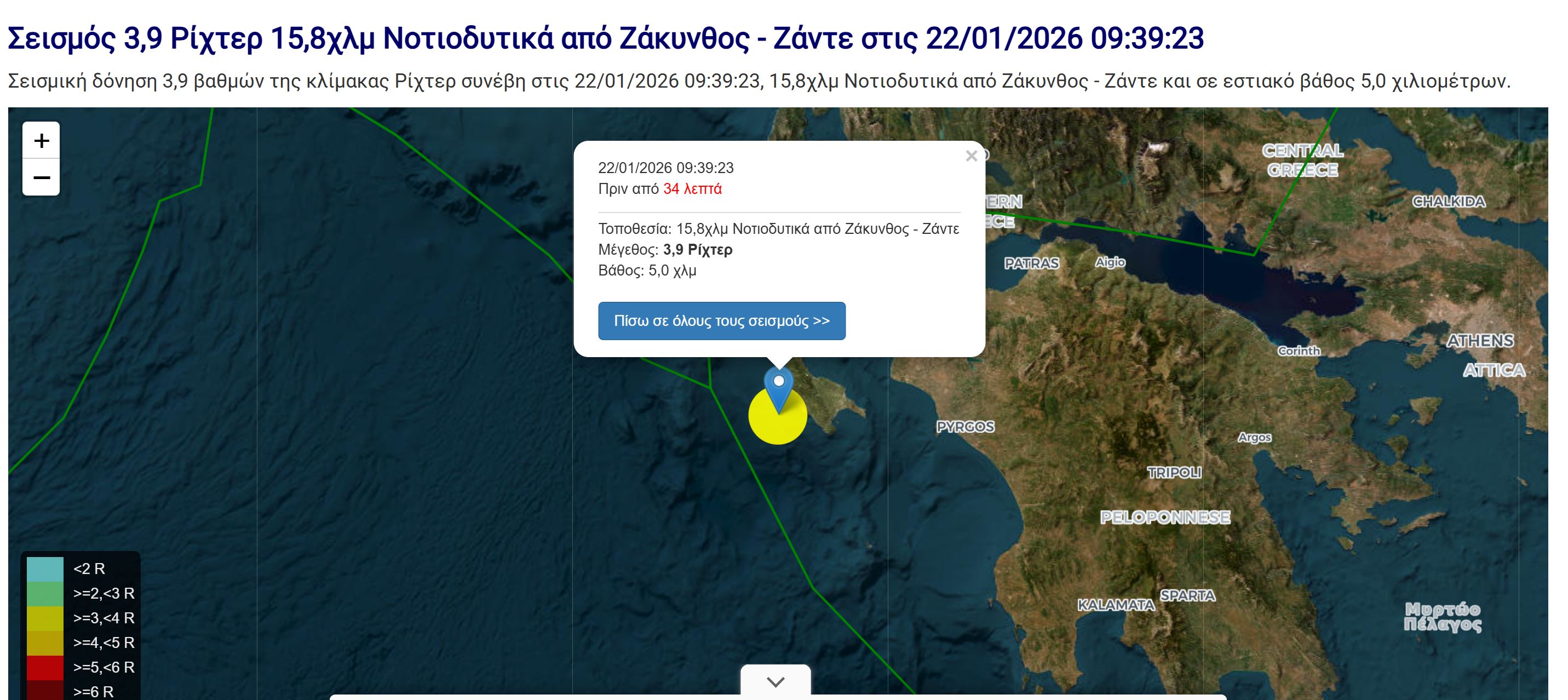 Σεισμική δόνηση μεγέθους 3,9 βαθμών της κλίμακας Ρίχτερ, Νοτιοδυτικά της Ζακύνθου, σημειώθηκε 9:39 το πρωί της Πέμπτης 22/1/2026