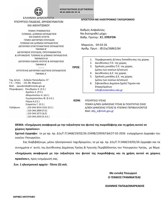 Η προστασία της υγείας και της ασφάλειας των μαθητών αποτελεί θεμελιώδη υποχρέωση της εκπαιδευτικής διοίκησης και βασική προτεραιότητα για κάθε σχολική κοινότητα. Στο πλαίσιο αυτό, το Υπουργείο Παιδείας, Θρησκευμάτων και Αθλητισμού απέστειλε πρόσφατα προς όλες τις Διευθύνσεις Πρωτοβάθμιας και Δευτεροβάθμιας Εκπαίδευσης και τις σχολικές μονάδες της χώρας ενημερωτικό έγγραφο σχετικά με την τοξικότητα του φυτού της πικροδάφνης και τη χρήση του σε χώρους πρασίνου.