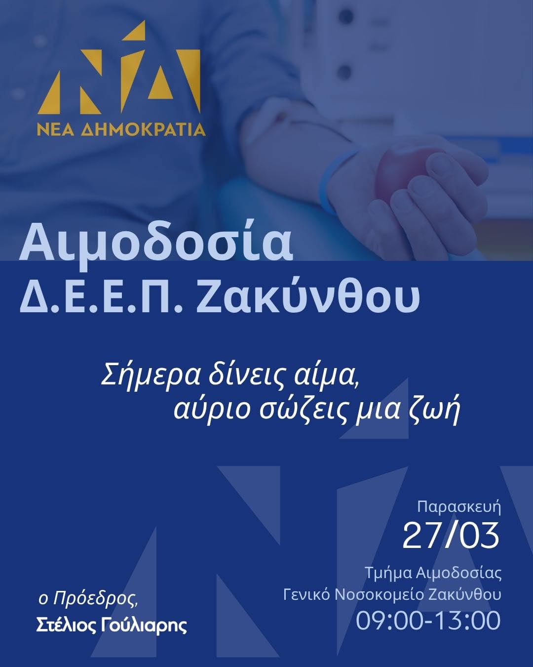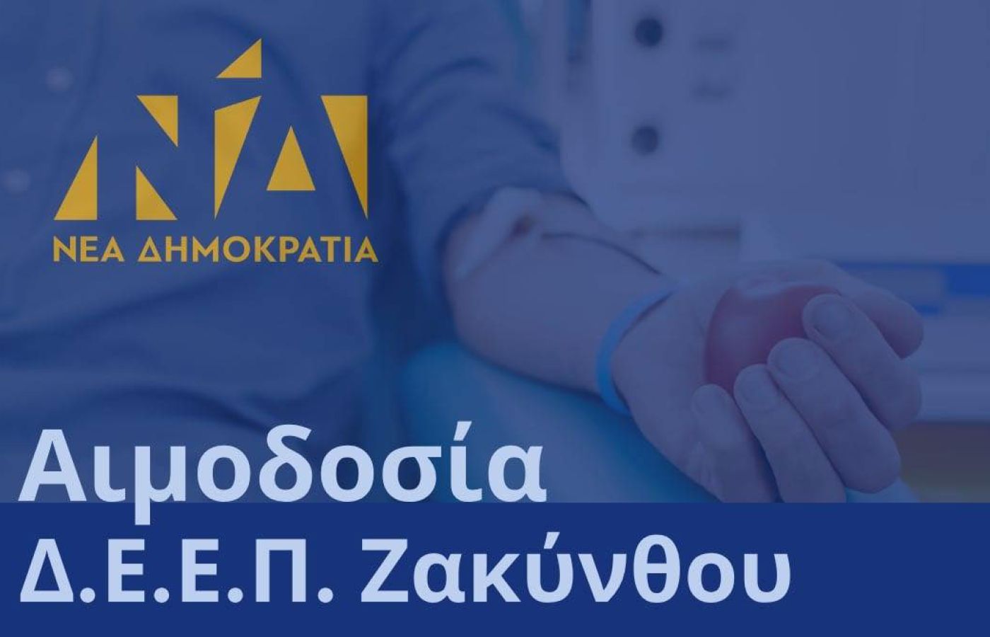 Η Διοικούσα Επιτροπή Εκλογικής Περιφέρειας Ζακύνθου της Νέας Δημοκρατίας καλεί όλους τους συμπολίτες που μπορούν να συμμετάσχουν στην αιμοδοσία που διοργανώνει την Παρασκευή 27 Μαρτίου, στο Τμήμα Αιμοδοσίας του Γενικού Νοσοκομείου Ζακύνθου, από τις 09:00 έως τις 13:00.