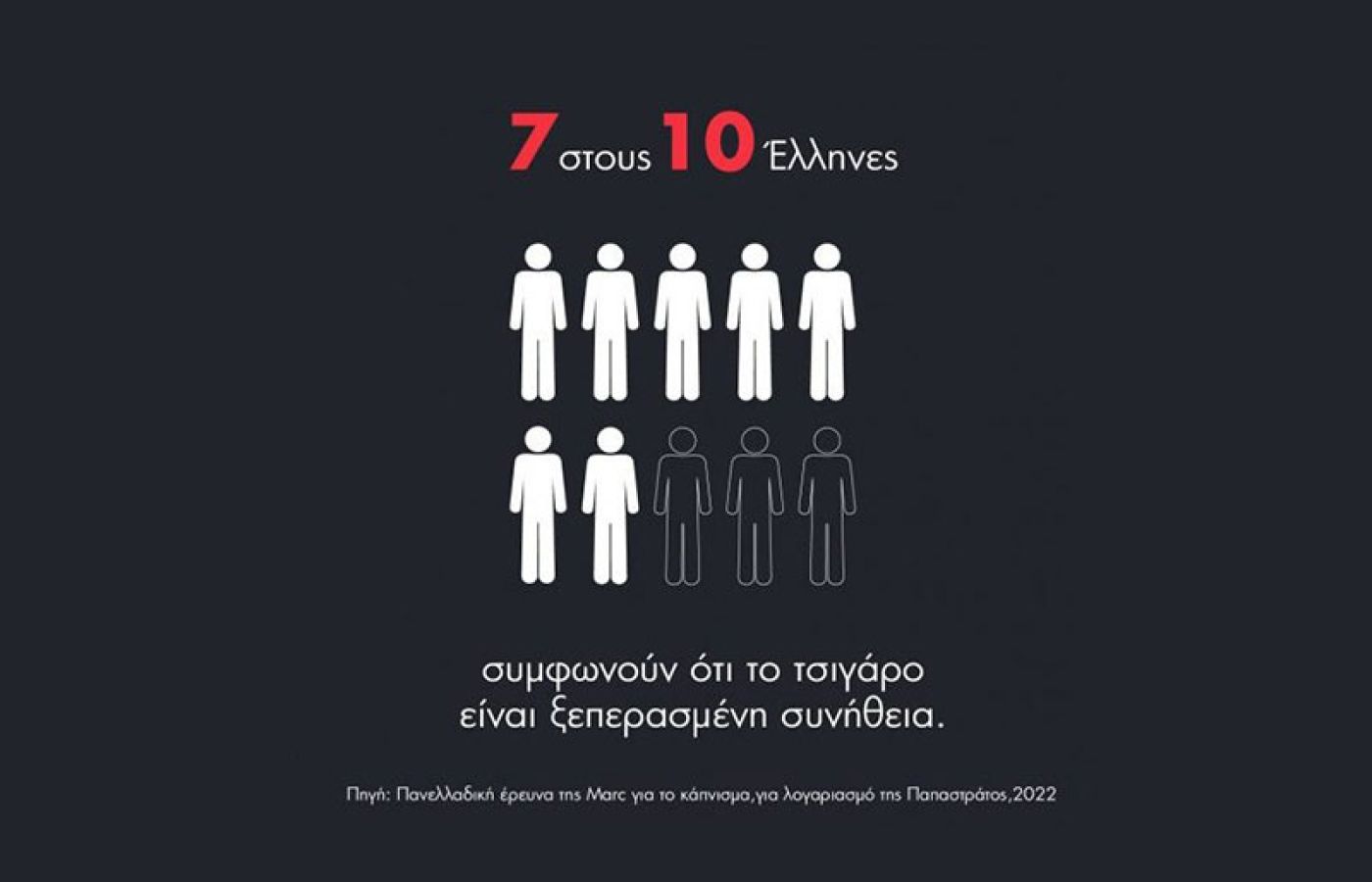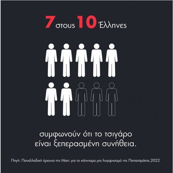 Είναι πλέον ξεκάθαρο πως υπάρχει μία σαφής αποστροφή του μεγαλύτερου μέρους της κοινωνίας απέναντι στο κάπνισμα, παρά το γεγονός ότι το ποσοστό των καπνιστών στην Ελλάδα παραμένει υψηλό. Επτά στους δέκα Έλληνες (72%) θεωρούν το τσιγάρο μία ξεπερασμένη συνήθεια. Σε σχέση με την αντίστοιχη έρευνα του 2021, οι ενστάσεις και η πίεση του κοινωνικού περιβάλλοντος καταγράφονται εντονότερες και η κοινωνική ανοχή μειώνεται με την πάροδο του χρόνου.