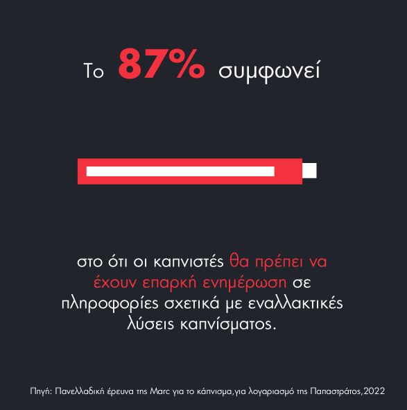 Και η φετινή έρευνα αναδεικνύει μια σοβαρή έλλειψη ενημέρωσης σχετικά με τα εναλλακτικά προϊόντα καπνίσματος. Μόλις ένας στους δέκα (11%) ερωτηθέντες ενήλικες δηλώνει επαρκώς ενημερωμένος, ποσοστό αυξημένο κατά 2% σε σύγκριση με το 2021. Η έλλειψη πληροφόρησης καταγράφεται σημαντική και στους καπνιστές. Από όσους καπνίζουν, μόνο το 22% δηλώνει πως έχει την πληροφόρηση που χρειάζεται για να μεταβεί από το τσιγάρο σε μια καλύτερη εναλλακτική. Υπάρχει μία καθολική άποψη (87%) πως οι καπνιστές θα πρέπει να έχουν επαρκή ενημέρωση και πρόσβαση σε πληροφορίες σχετικά με τα νέα εναλλακτικά προϊόντα νικοτίνης. Ιδιαίτερο ενδιαφέρον παρουσιάζει το υψηλό ποσοστό (63%) εκείνων που συμφωνούν με την άποψη πως ο βαθμός βλαπτικότητας ενός καπνικού προϊόντος θα πρέπει να λαμβάνεται υπόψιν κατά την φορολόγησή του, όπως αντίστοιχα συμβαίνει σε άλλους κλάδους, π.χ. ενέργεια, αυτοκίνηση.