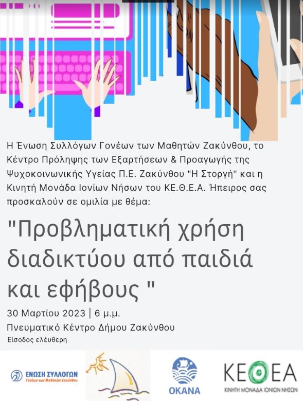 «KEΘΕΑ-ΣΤΟΡΓΗ-ΕΝΩΣΗ ΓΟΝΕΩΝ πραγματοποιούμε ομιλία με θέμα «Προβληματική χρήση διαδικτύου από παιδιά και εφήβους» την Πέμπτη 30/3 στο Πνευματικό Κέντρο στις 6 το απόγευμα.