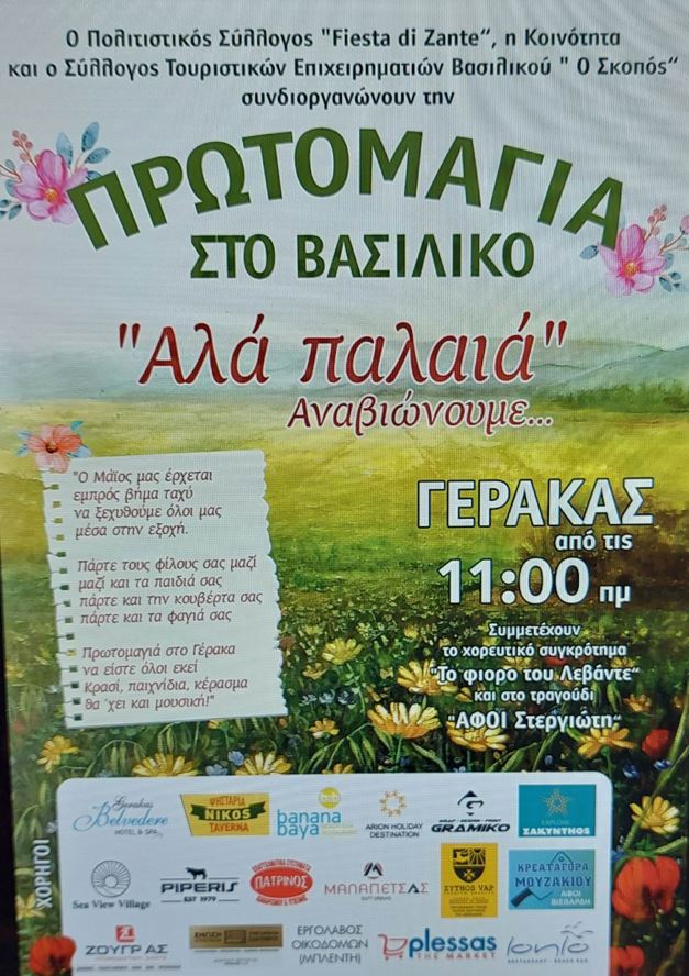Ο πολιτιστικός σύλλογος «fiesta di Zante» , η κοινότητα και ο Σύλλογος Τουριστικών Επιχειρηματιών Βασιλικού «Ο ΣΚΟΠΟΣ» , αναβιώνουν «ΑΛΑ ΠΑΛΑΙΑ» το Πρωτομαγιάτικο γλέντι στον Βασιλικό Ζακύνθου .