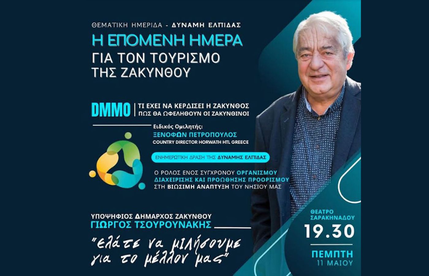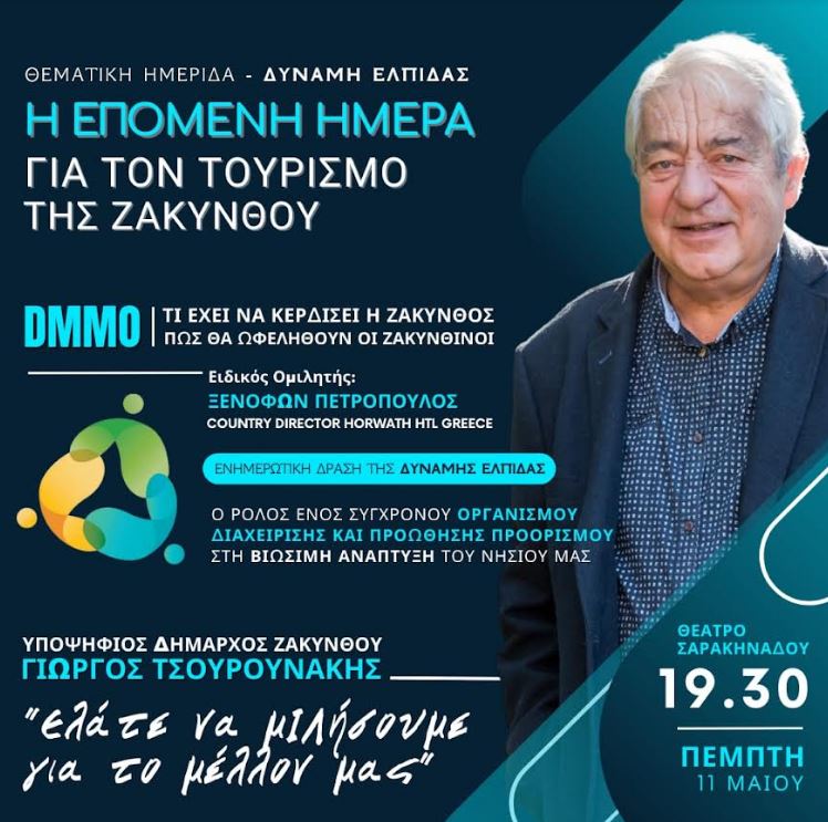 Την Πέμπτη, 11 Μαΐου, στις 19.30 το απόγευμα, στο Θέατρο Σαρακηνάδου, ο συνδυασμός «Δύναμη Ελπίδας για τη Ζάκυνθο», με επικεφαλής τον Γιώργο Τσουρουνάκη, διοργανώνει ειδική ενημερωτική ημερίδα για τη διαχείριση της επόμενης μέρας στον τουρισμό, κατά την οποία ο Ξενοφών Πετρόπουλος (country director, Ηοrwarth HTL Greece) θα παρουσιάσει τον καίριο ρόλο που μπορεί να διαδραματίσει στην προώθηση και ανάπτυξη του τουριστικού προϊόντος της Ζακύνθου ένας σύγχρονος Οργανισμός Διαχείρισης και Προώθησης Προορισμού (DMMO).