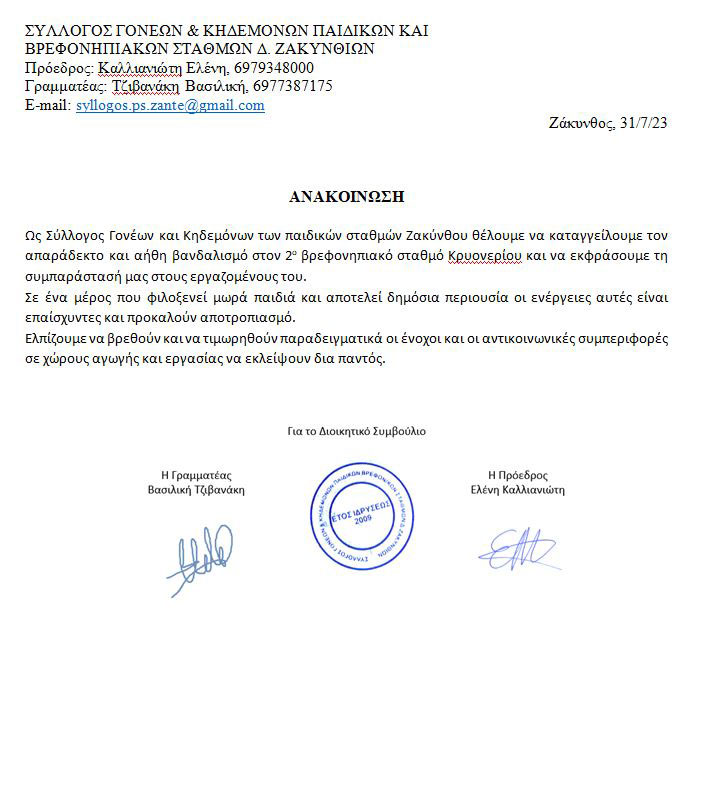 Ως Σύλλογος Γονέων και Κηδεμόνων των παιδικών σταθμών Ζακύνθου με ανακοίνωση τους καταγγέλλουν «τον απαράδεκτο και αήθη βανδαλισμό στον 2ο βρεφονηπιακό σταθμό Κρυονερίου» ενώ παράλληλα εκφράζουν τη συμπαράστασή τους στους εργαζομένους του.