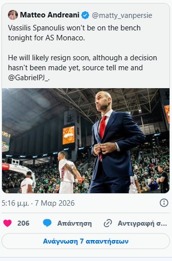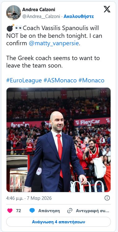 Νωρίτερα σήμερα (7/3) και πάλι ο Αντρεάνι είχε αναφέρει πως «ο Βασίλης Σπανούλης δεν θα βρίσκεται στον πάγκο της Μονακό απόψε. Είναι πιθανό να παραιτηθεί σύντομα, αν και ακόμη δεν έχει ληφθεί οριστική απόφαση».