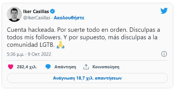 -Ο Ίκερ Κασίγιας δύο ώρες μετά το tweet με το οποίο «αποκάλυπτε» ότι είναι γκέι, απέδωσε τη ανάρτηση σε χάκερ