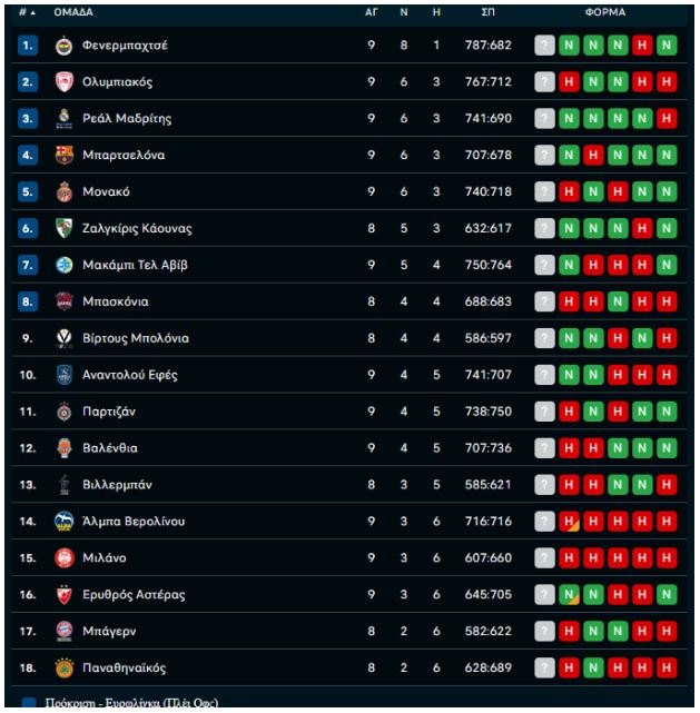 Η βαθμολογία της Euroleague μετά την ήττα του Ολυμπιακού στο Ισραήλ