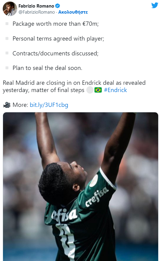 Ποδοσφαιριστής της Ρεάλ Μαδρίτης θα πρέπει να θεωρείται ο Έντρικ της Παλμέιρας!