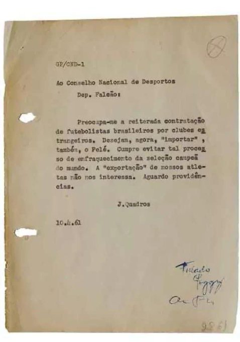 «Ανησυχώ για την επαναλαμβανόμενη πρόσληψη Βραζιλιάνων ποδοσφαιριστών από συλλόγους του εξωτερικού. Τώρα θέλουν να πάρουν και τον Πελέ. Η εξαγωγή αθλητών δεν μας ενδιαφέρει. Περιμένω μέτρα» ανέφερε η επιστολή το περιεχόμενο της οποίας έγινε νόμος!