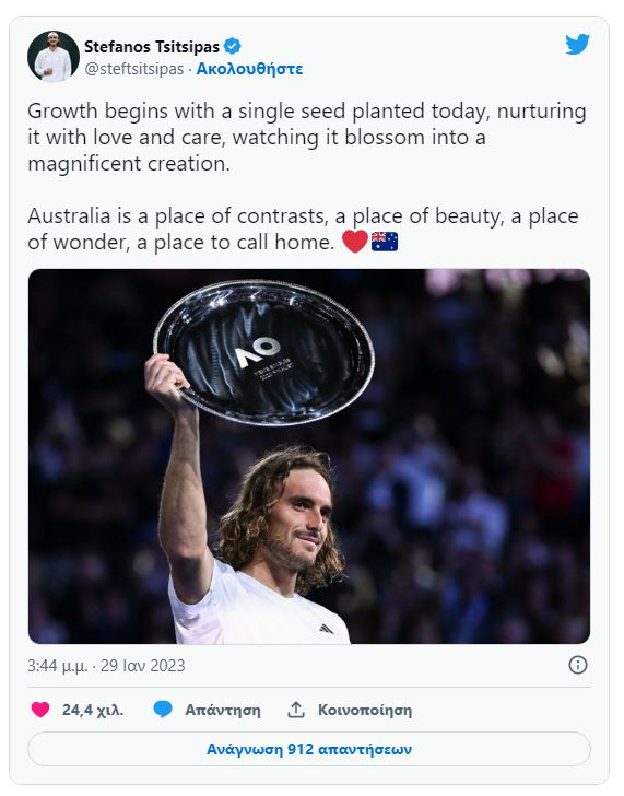 Το tweet του Τσιτσιπά μετά τον τελικό: «Η εξέλιξη ξεκινά με έναν μόνο σπόρο που φυτεύτηκε σήμερα»