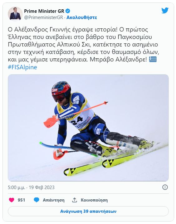 Συγχαρητήρια ανάρτηση για τον Αλέξανδρο Γκιννή έκανε και ο πρωθυπουργός Κυριάκος Μητσοτάκης που σημειώνει ότι ο Αλέξανδρος Γκιννής «κέρδισε τον θαυμασμό όλων, και μας γέμισε περηφάνεια. Μπράβο Αλέξανδρε!». Η ανάρτηση του πρωθυπουργού: