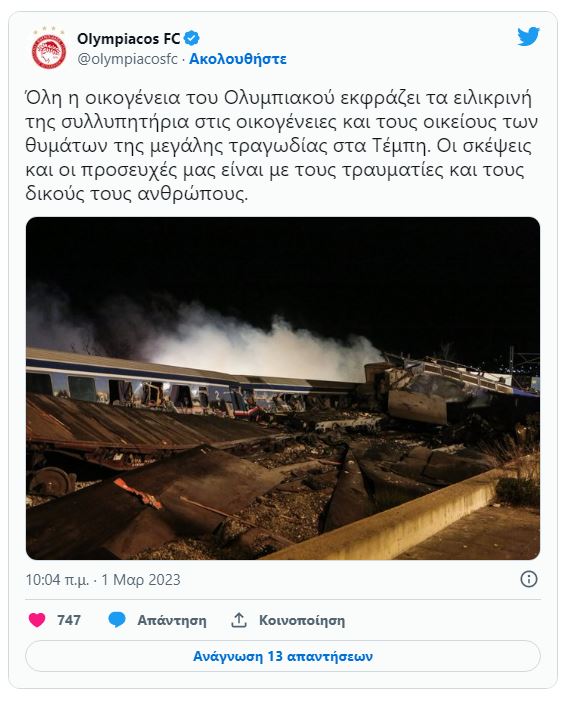 «Όλη η οικογένεια του Ολυμπιακού εκφράζει τα ειλικρινή της συλλυπητήρια στις οικογένειες και τους οικείους των θυμάτων της μεγάλης τραγωδίας στα Τέμπη. Οι σκέψεις και οι προσευχές μας είναι με τους τραυματίες και τους δικούς τους ανθρώπους», αναφέρει το μήνυμα της ερυθρόλευκης ΠΑΕ στα social media.
