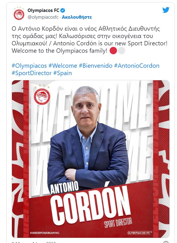 Η ΠΑΕ Ολυμπιακός ανακοινώνει την έναρξη της συνεργασίας της με τον κ. Αντόνιο Κορδόν Ρουίθ, ο οποίος αναλαμβάνει τη θέση του αθλητικού διευθυντή.