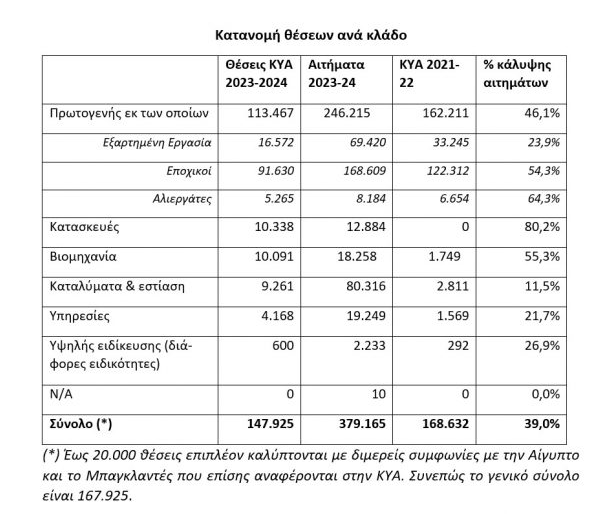 Συνολικά με την υπουργική απόφαση εγκρίθηκε η εισαγωγή 147.925 εργαζομένων από τρίτες χώρες, με την συντριπτική πλειονότητα να αφορά θέσεις εργασίας στο πρωτογενή τομέα. Επιπλέον 20.000 θέσεις θα καλυφθούν με διμερείς συμφωνίες με την Αίγυπτο και το Μπαγκλαντές.